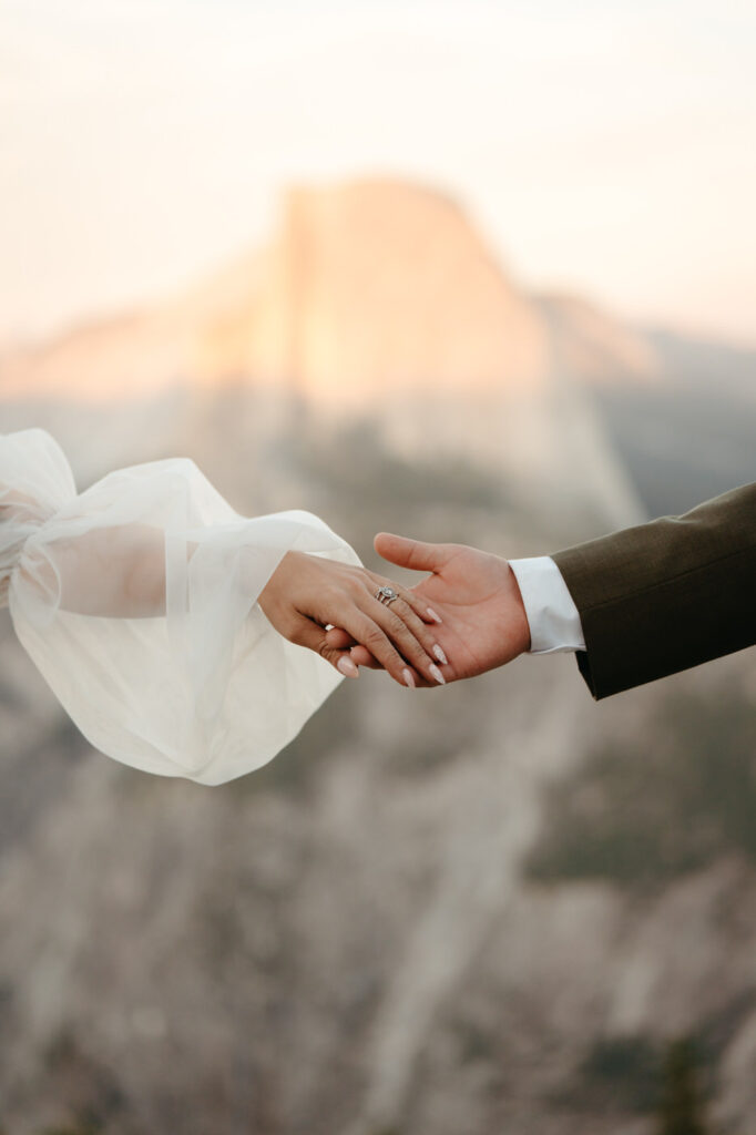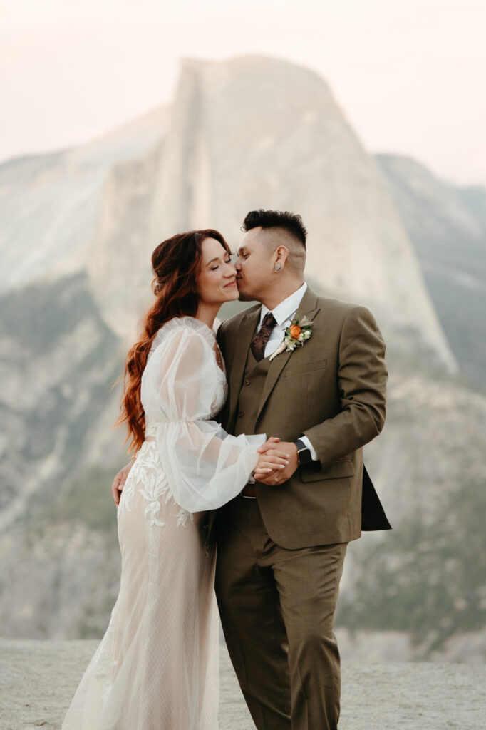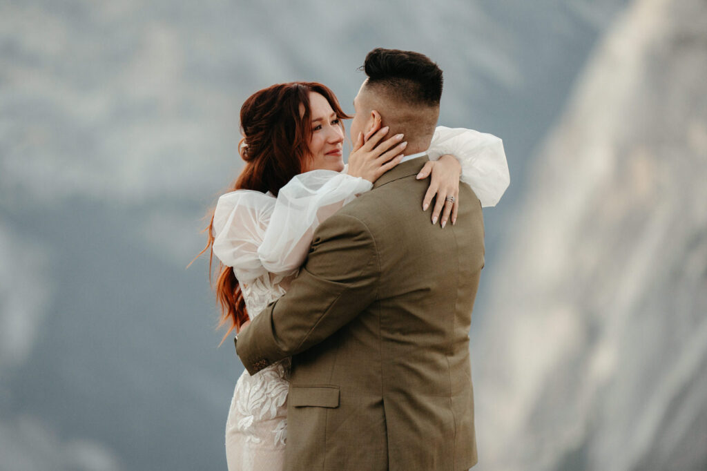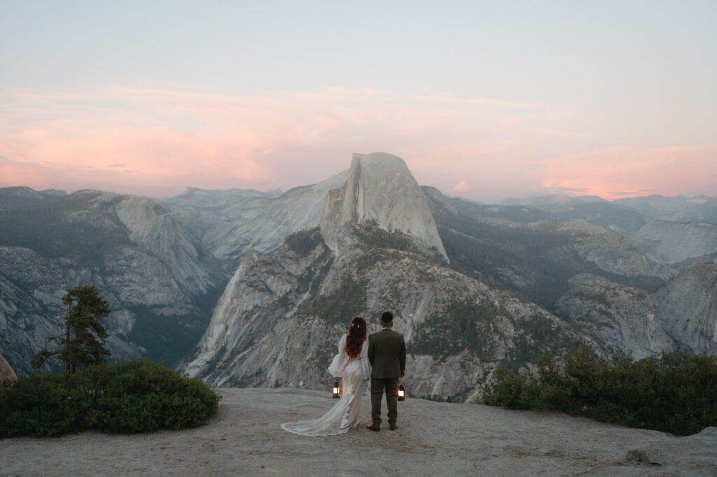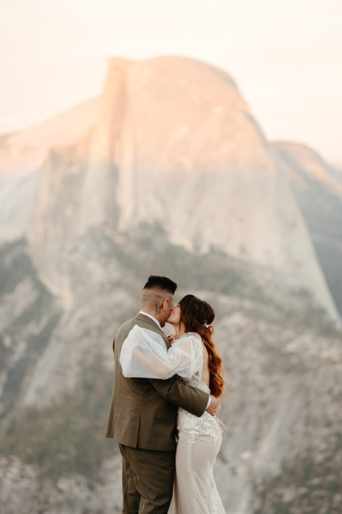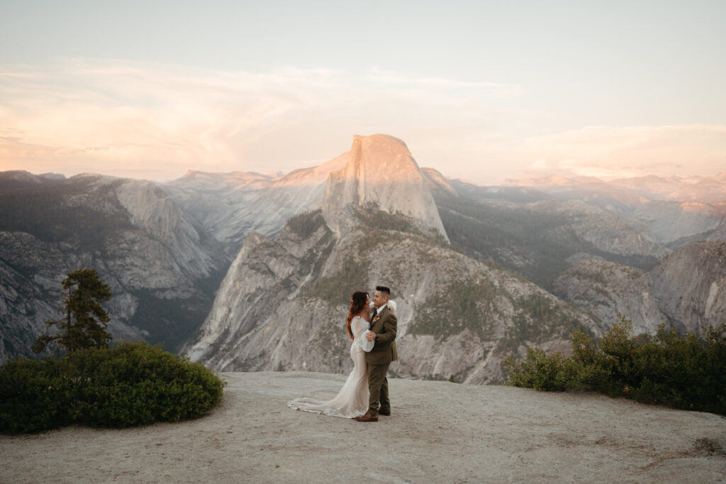 They took time at the viewpoint to slow down and just be with each other. They danced their private first dance as the sun set, and we underexposed our images a little while we photographed to be able to fully capture the alpenglow on Half Dome behind them when we edited, the golden light painting the granite was absolutely magical.