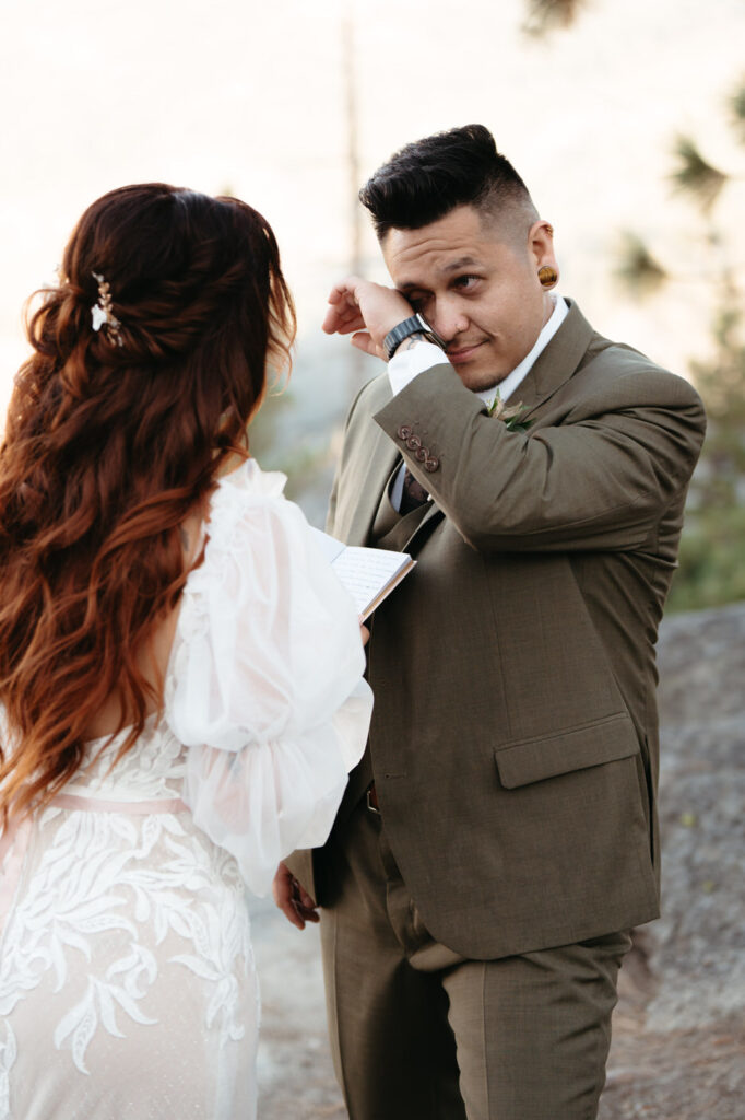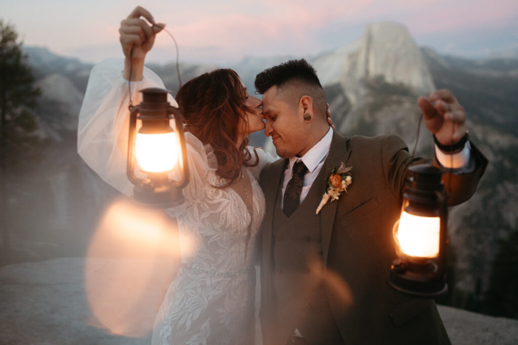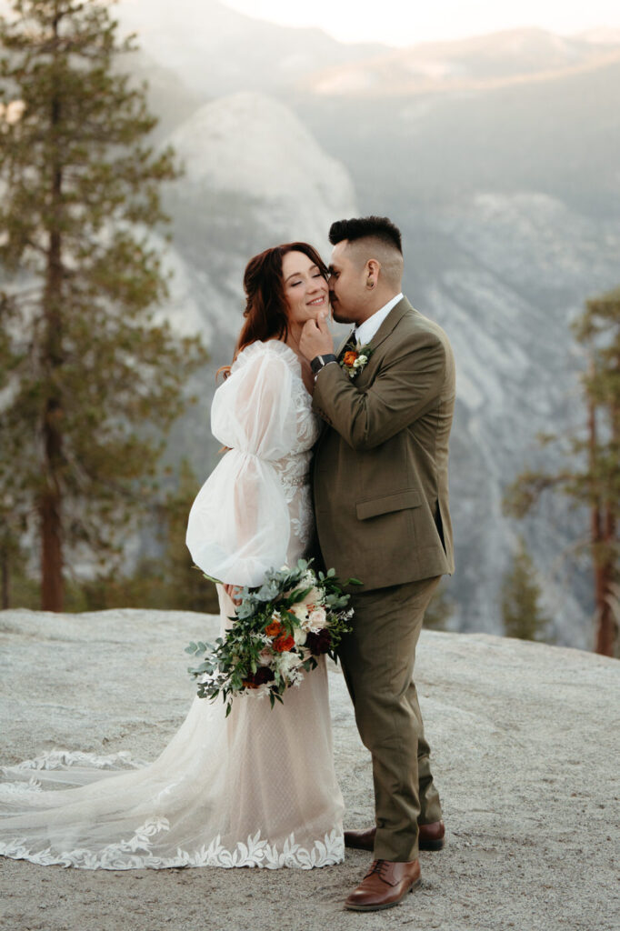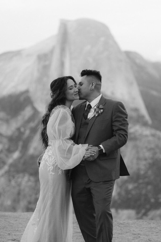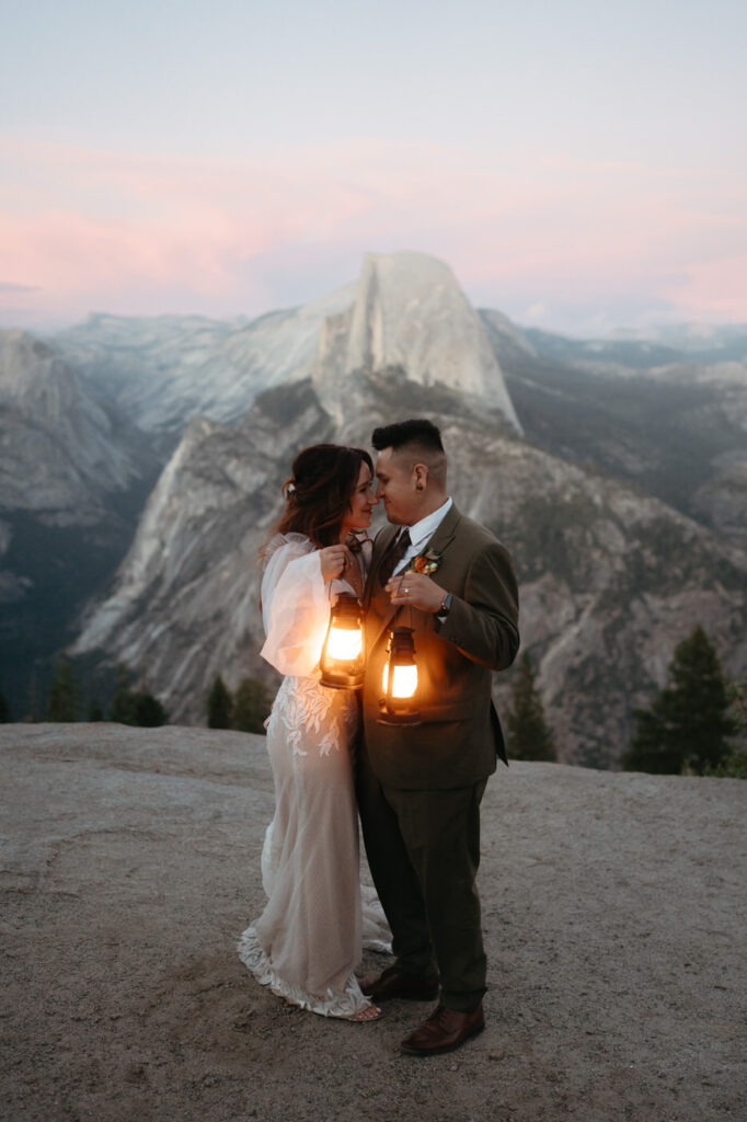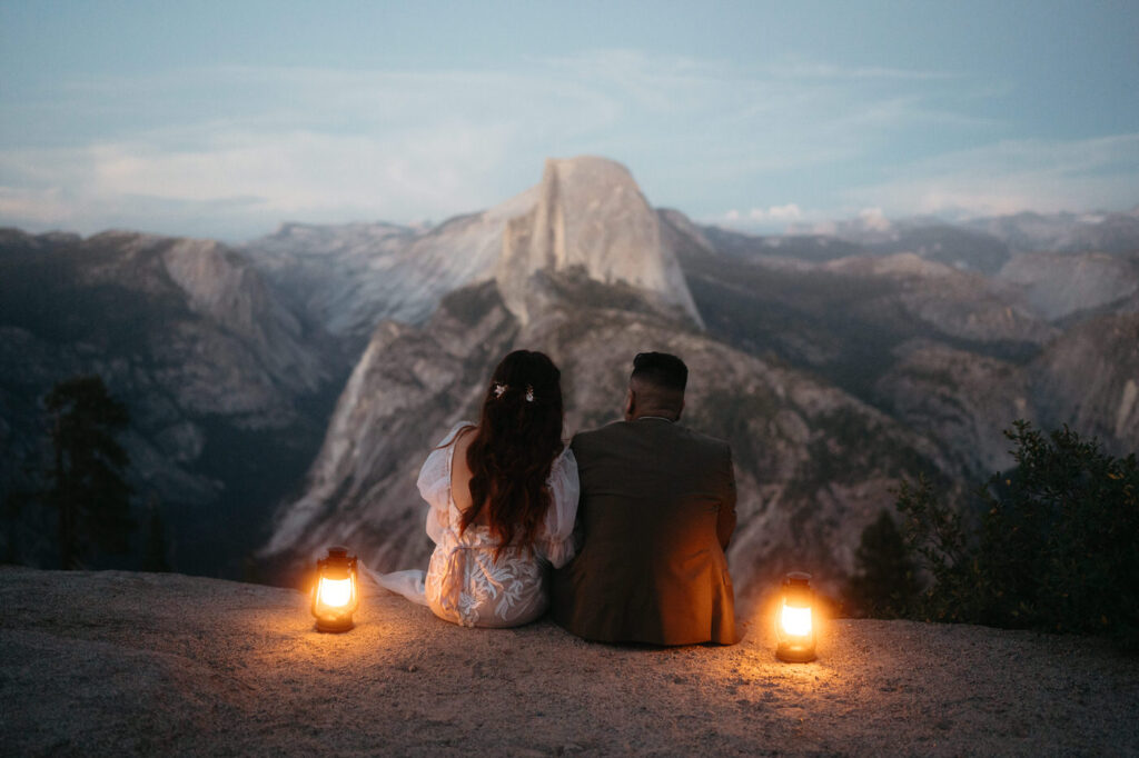They took time at the viewpoint to slow down and just be with each other. They danced their private first dance as the sun set, and we underexposed our images a little while we photographed to be able to fully capture the alpenglow on Half Dome behind them when we edited, the golden light painting the granite was absolutely magical.