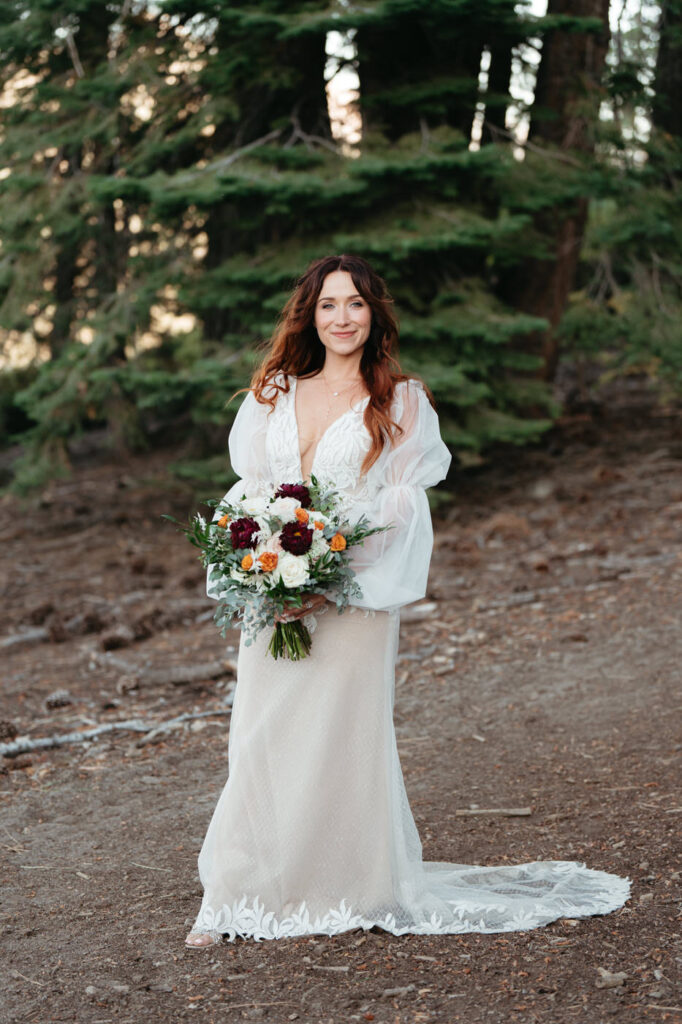 After wiping away tears from their vows, they hiked through the forest toward a stunning viewpoint we’d found for them. We used the nice even lighting in the forest between locations to capture individual portraits of them, letting their unique style shine.