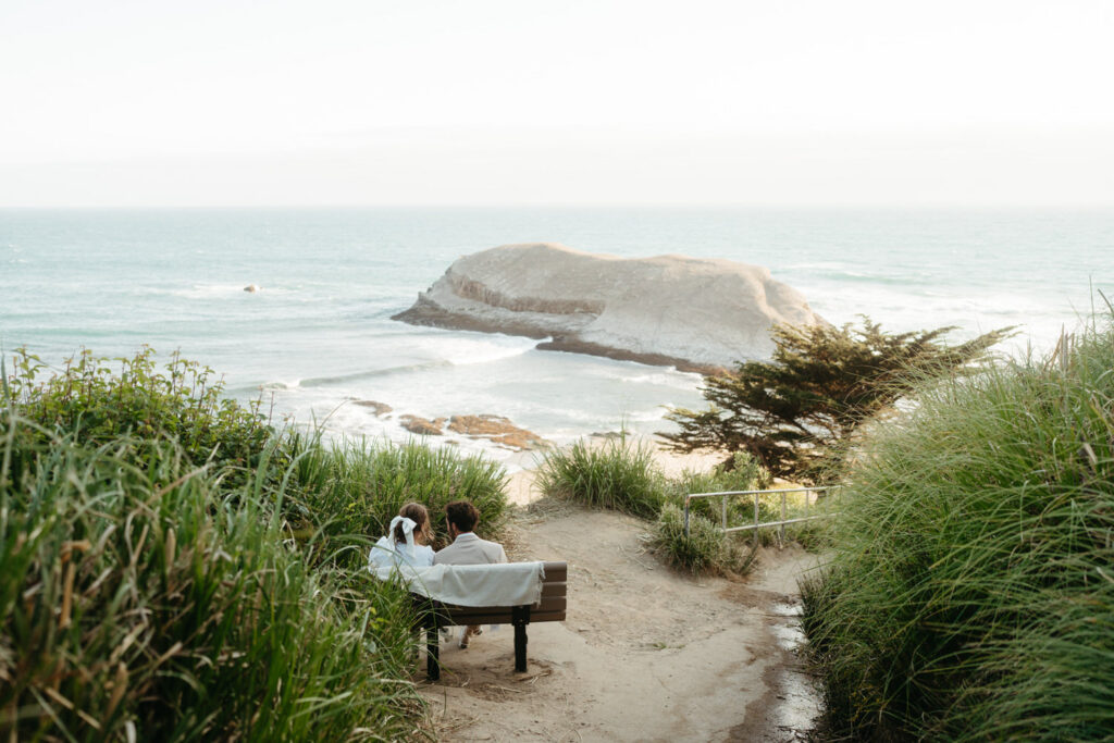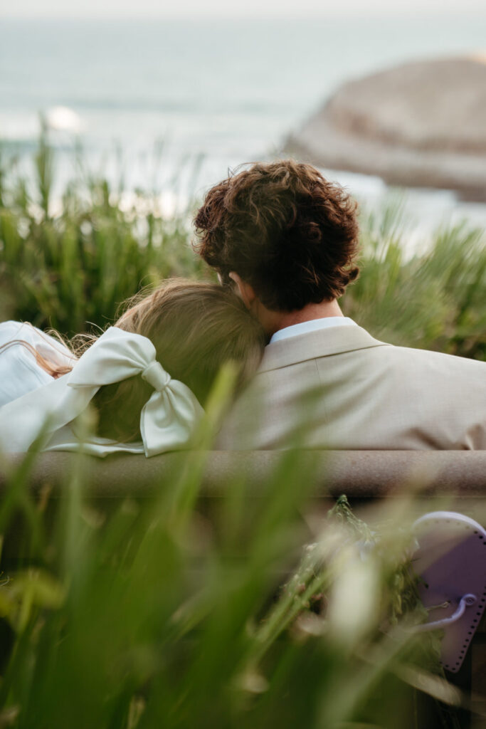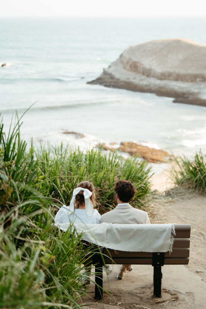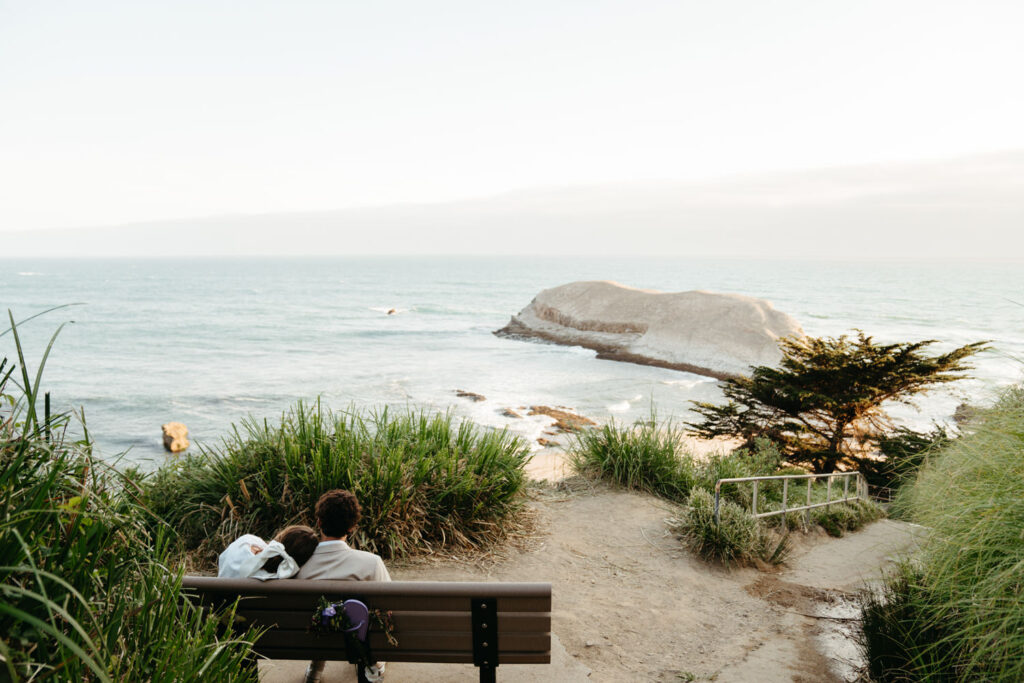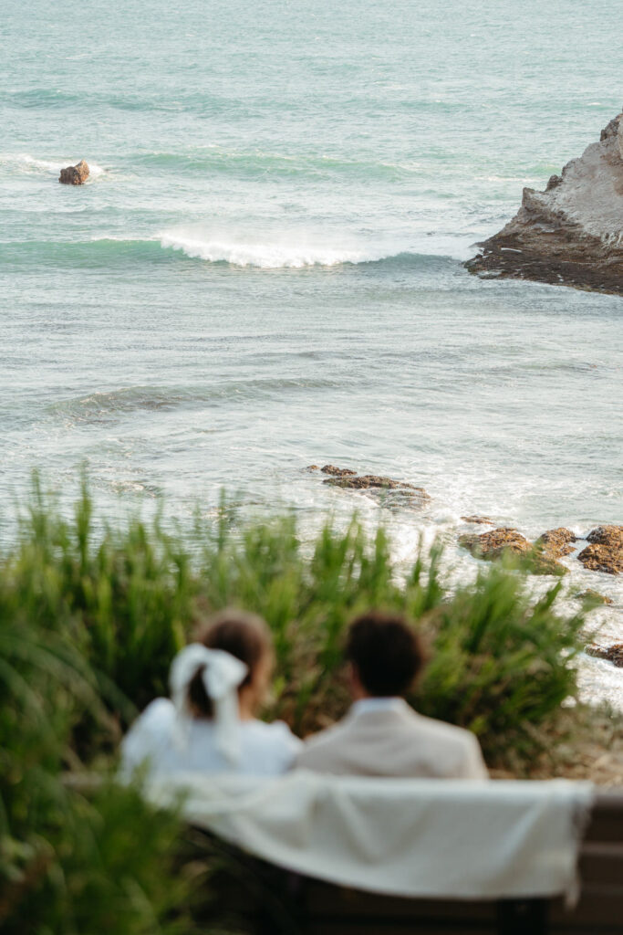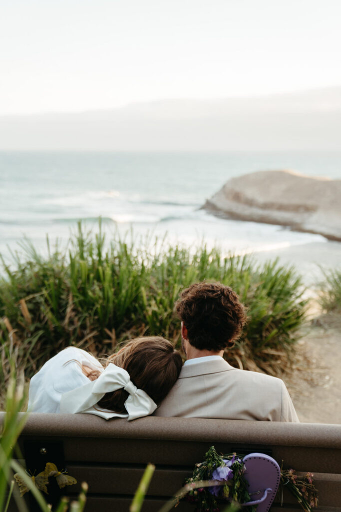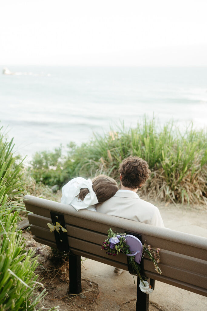 After saying goodbye to their family, they took some time to slow down and soak in the moment, sitting on a bench with a beautiful view overlooking the beach. Their intentionality to simply be present added to the overall sense of peace that rested over their whole day.