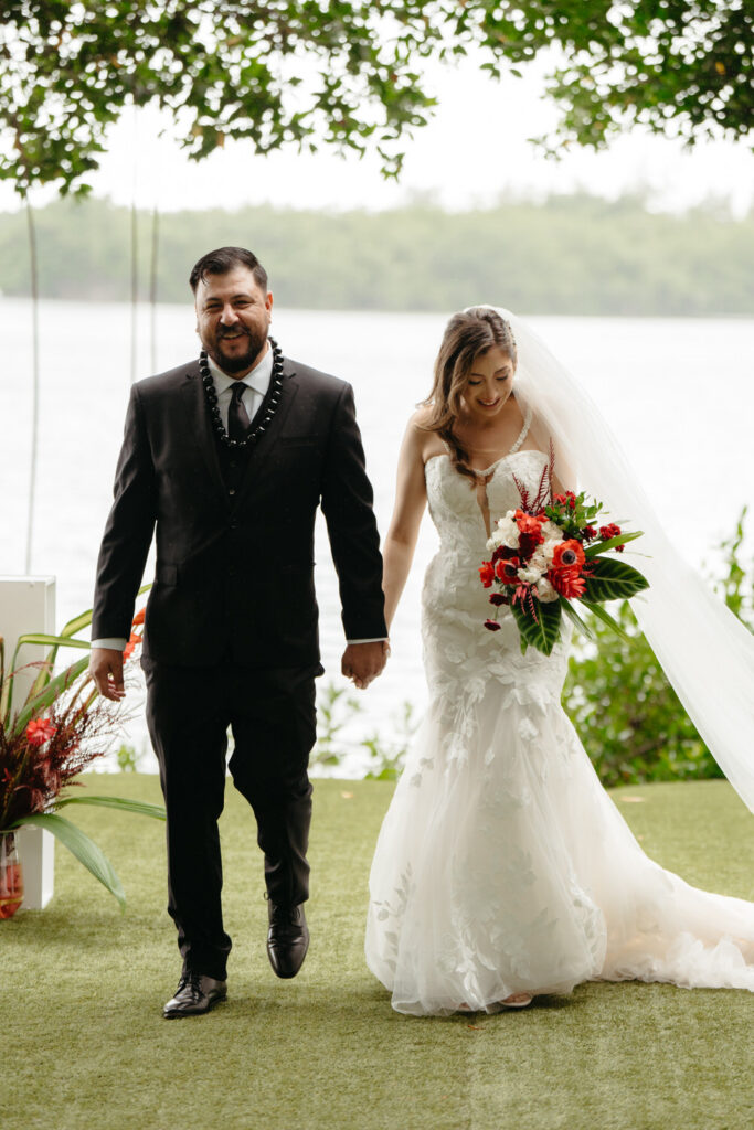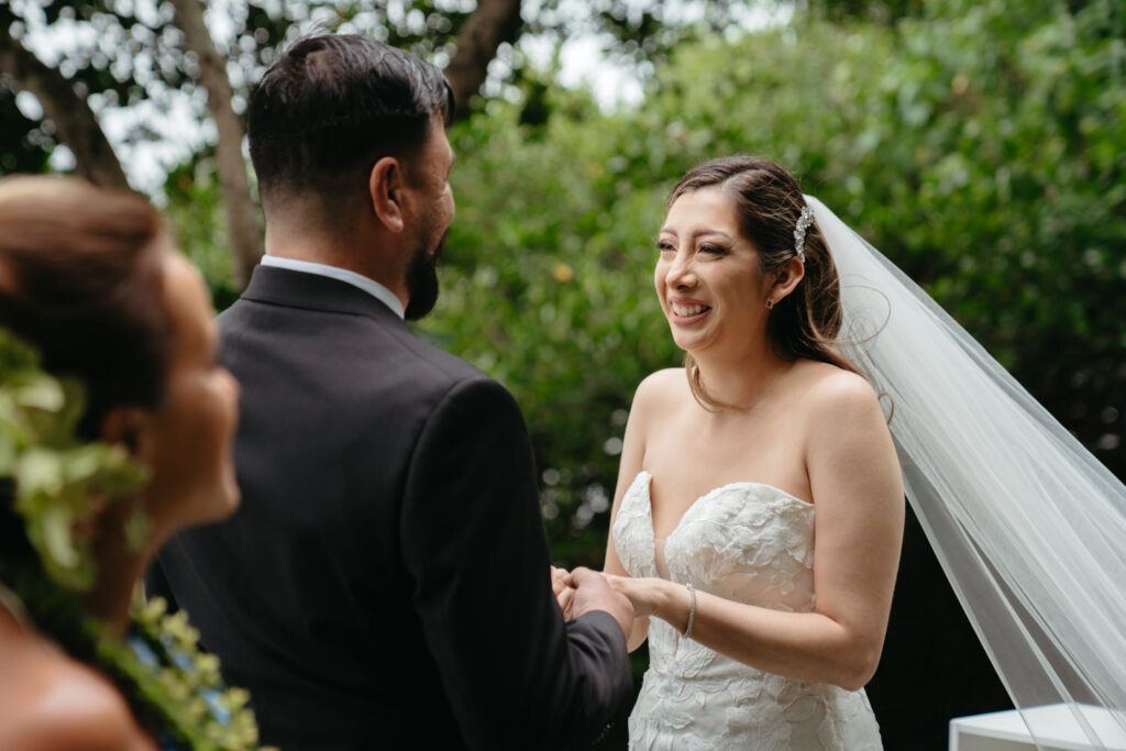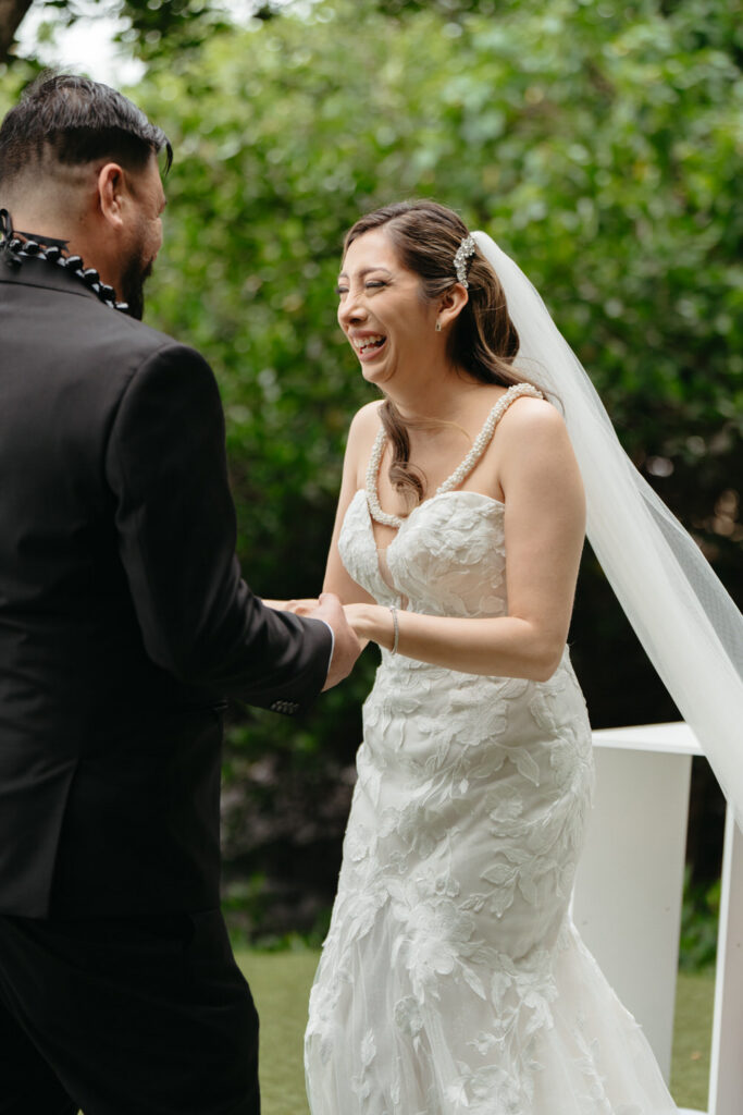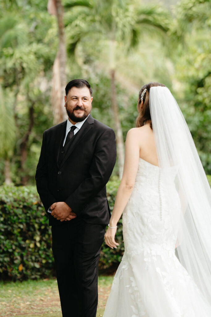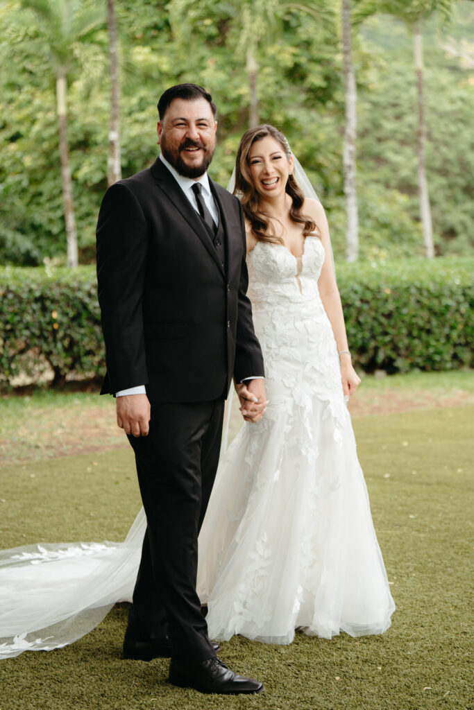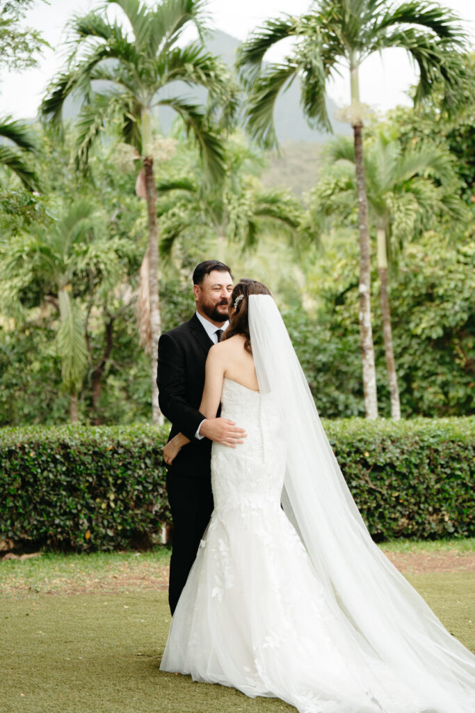 Palm trees swayed in the tropical breeze as Joanna and Tommy got ready for their ceremony at the stunning Moli’i Gardens at Kualoa Ranch. Tommy couldn’t wait to see Joanna and his face exploded with joy during their first look – after lots of hugs and comments about how good they both looked, it was time to descend a regal spiral staircase and say their vows.