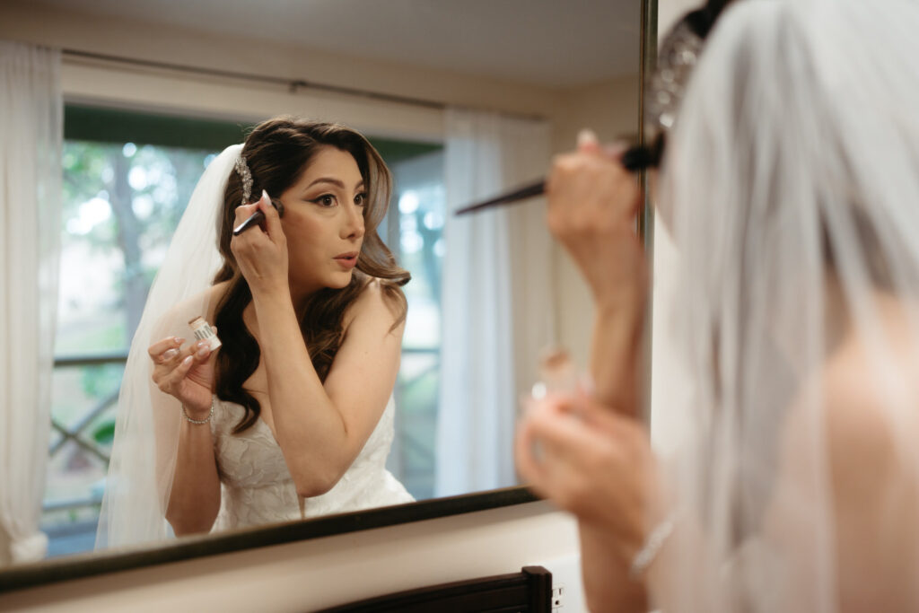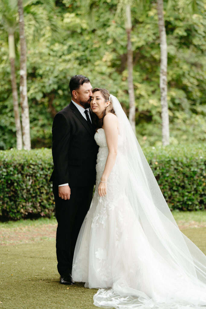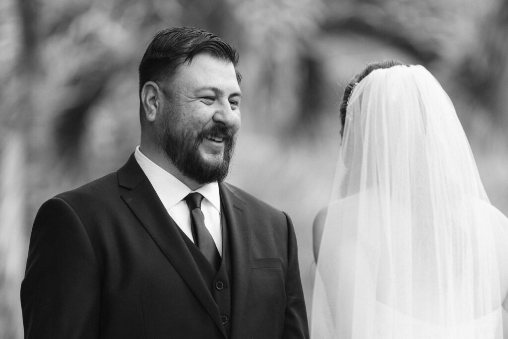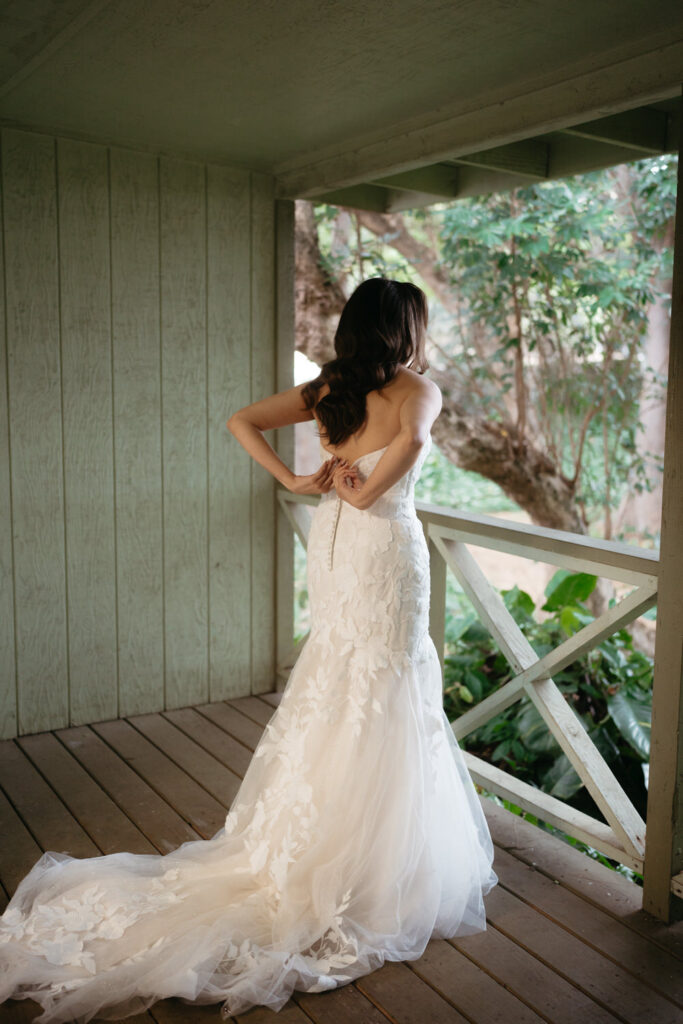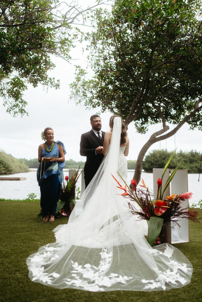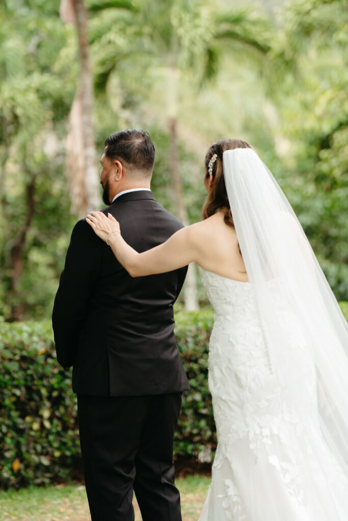 Palm trees swayed in the tropical breeze as Joanna and Tommy got ready for their ceremony at the stunning Moli’i Gardens at Kualoa Ranch. Tommy couldn’t wait to see Joanna and his face exploded with joy during their first look – after lots of hugs and comments about how good they both looked, it was time to descend a regal spiral staircase and say their vows.