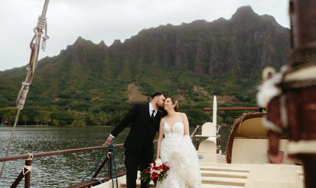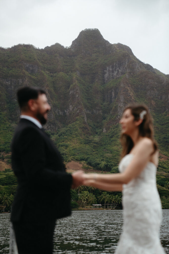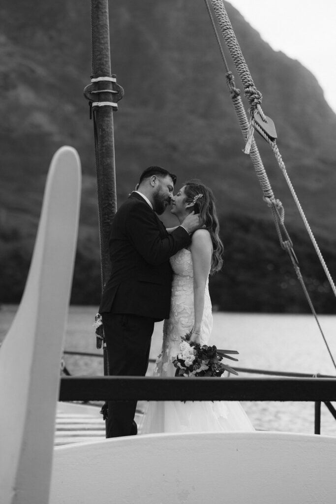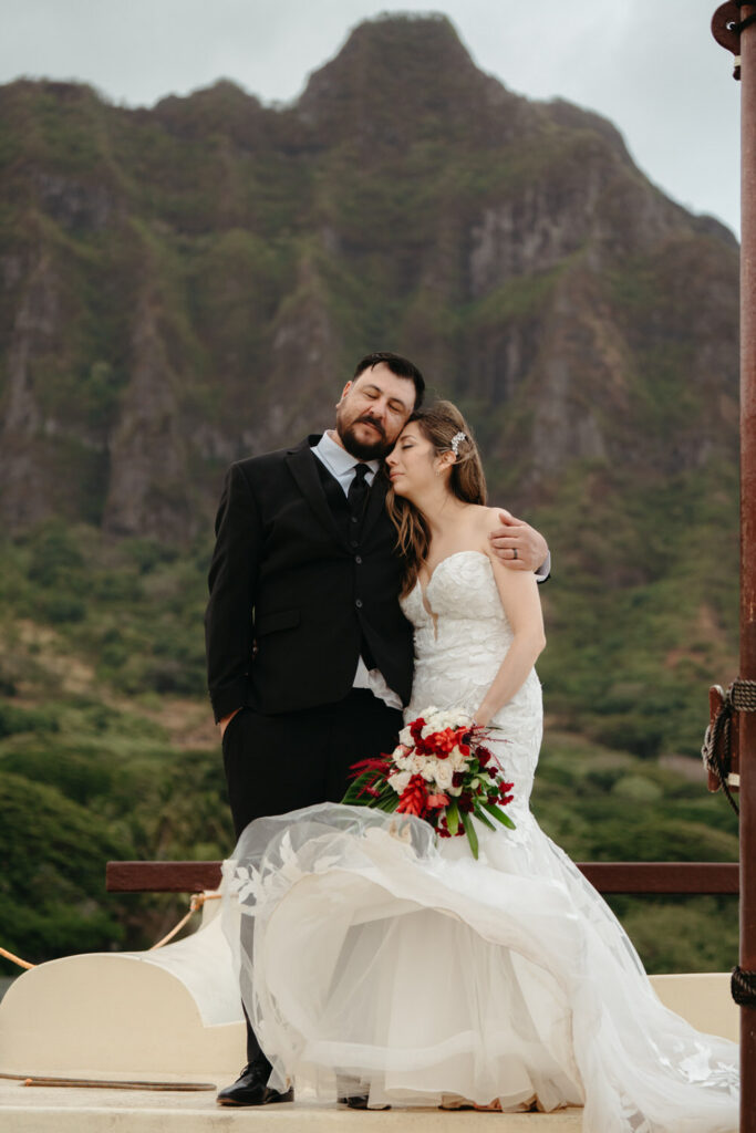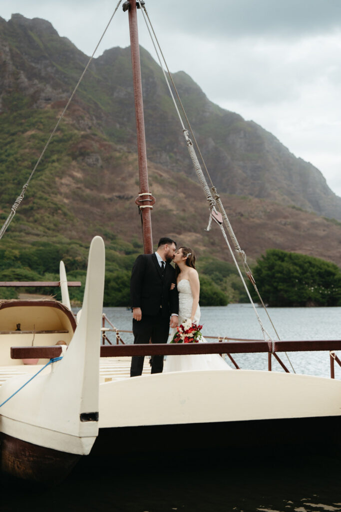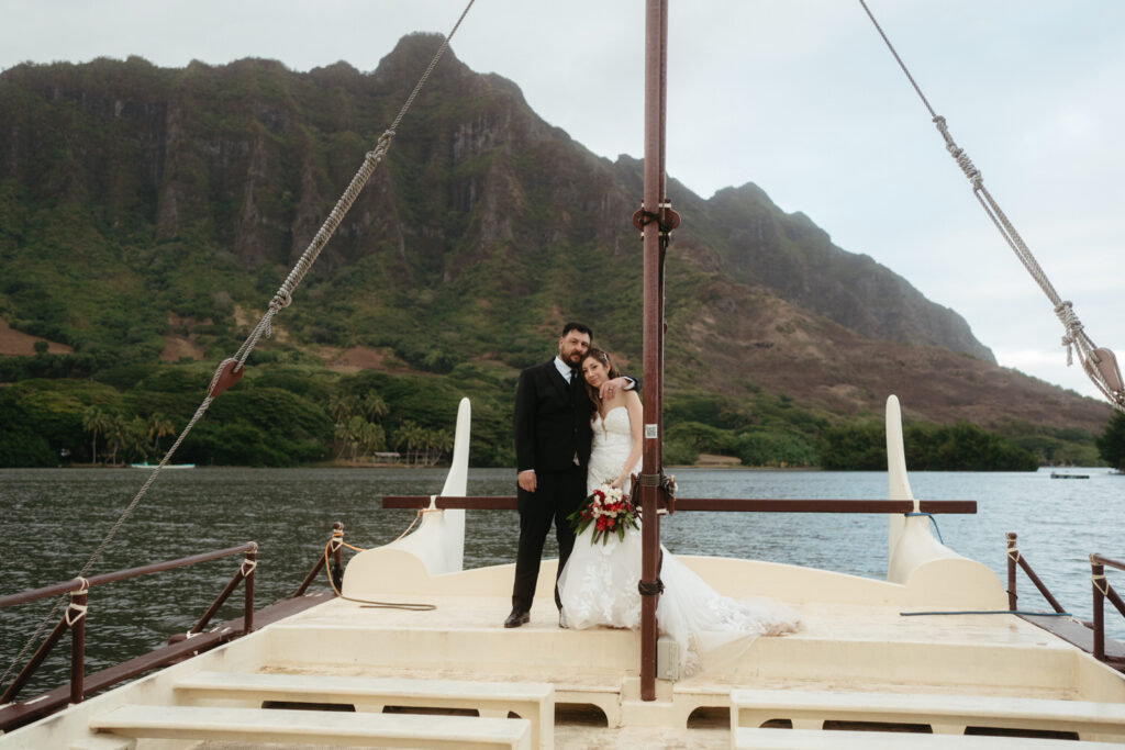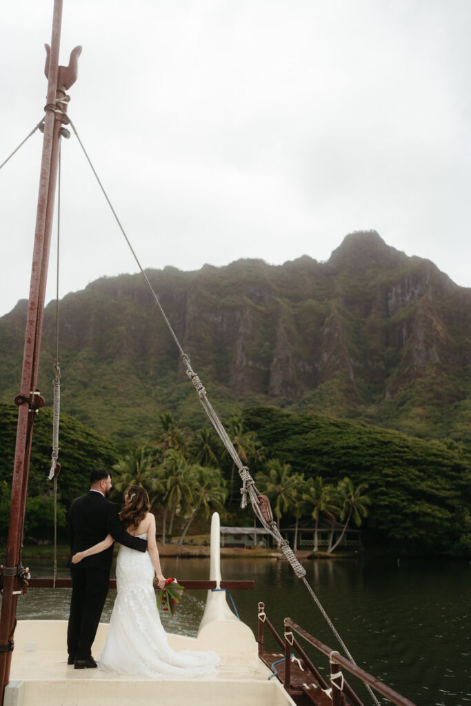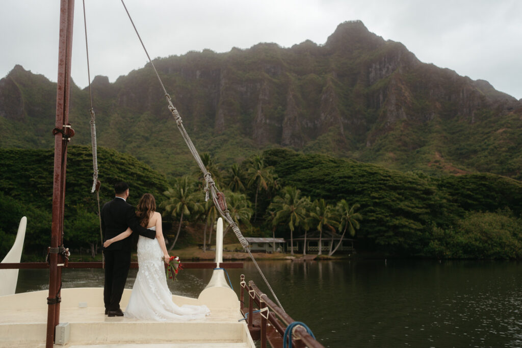 The crown jewel of the day was a private boat ride out to Secret Island, where they stepped out onto a private dock to slow down and enjoy the majesty of the Koʻolau Mountains. We photographed the boat ride by embracing the nautical vibes and capturing them peering out at the island framed by the mast and ropes.