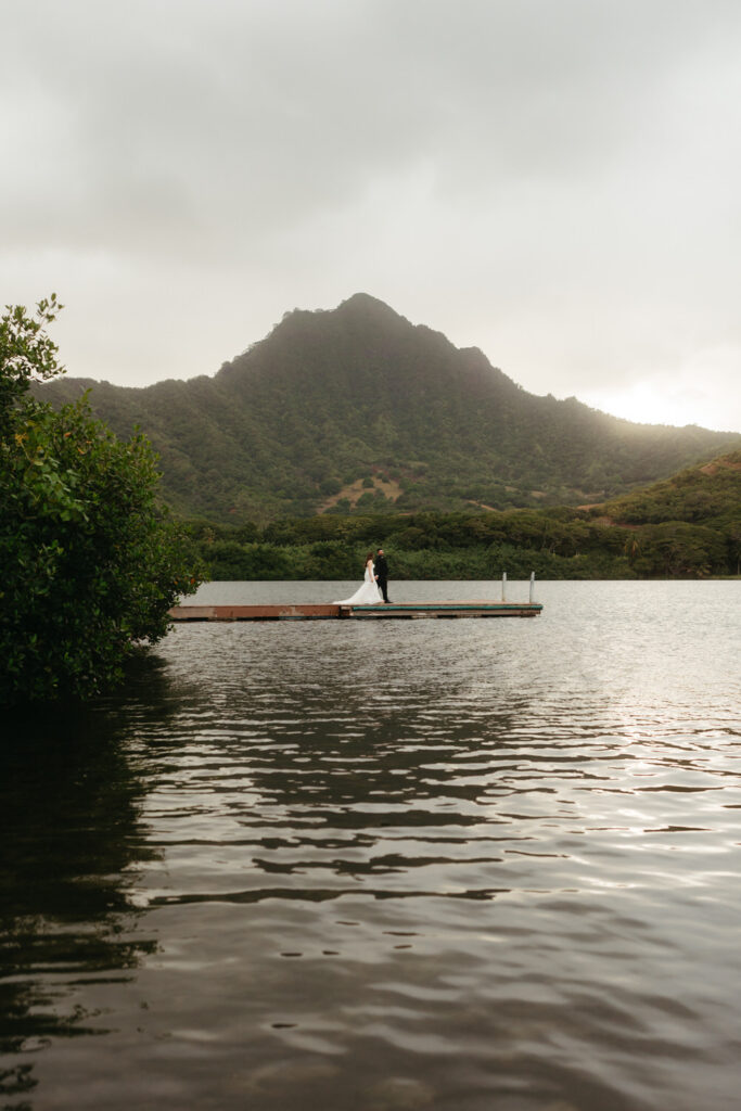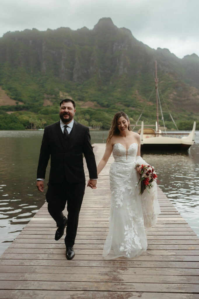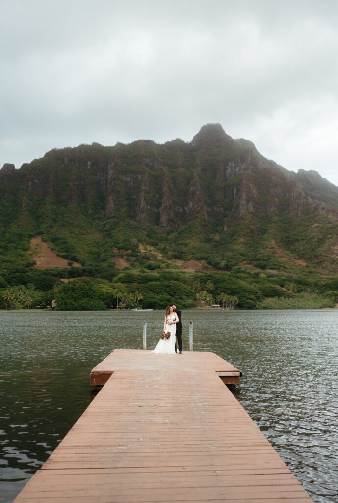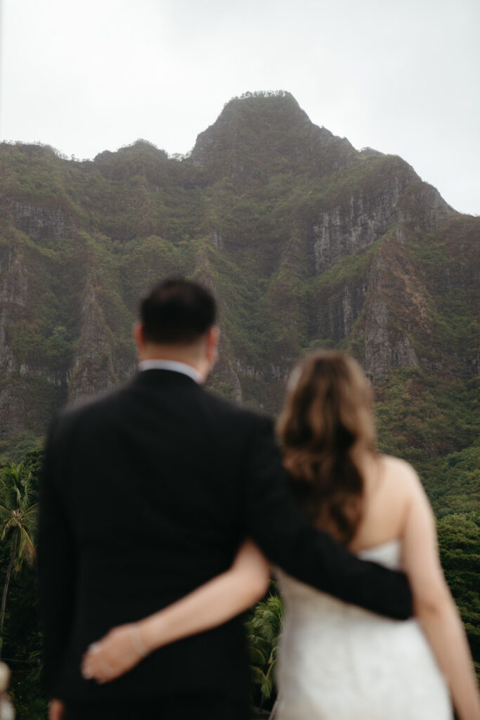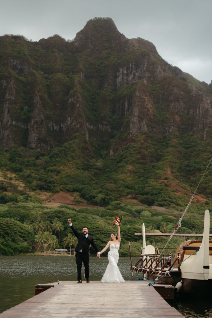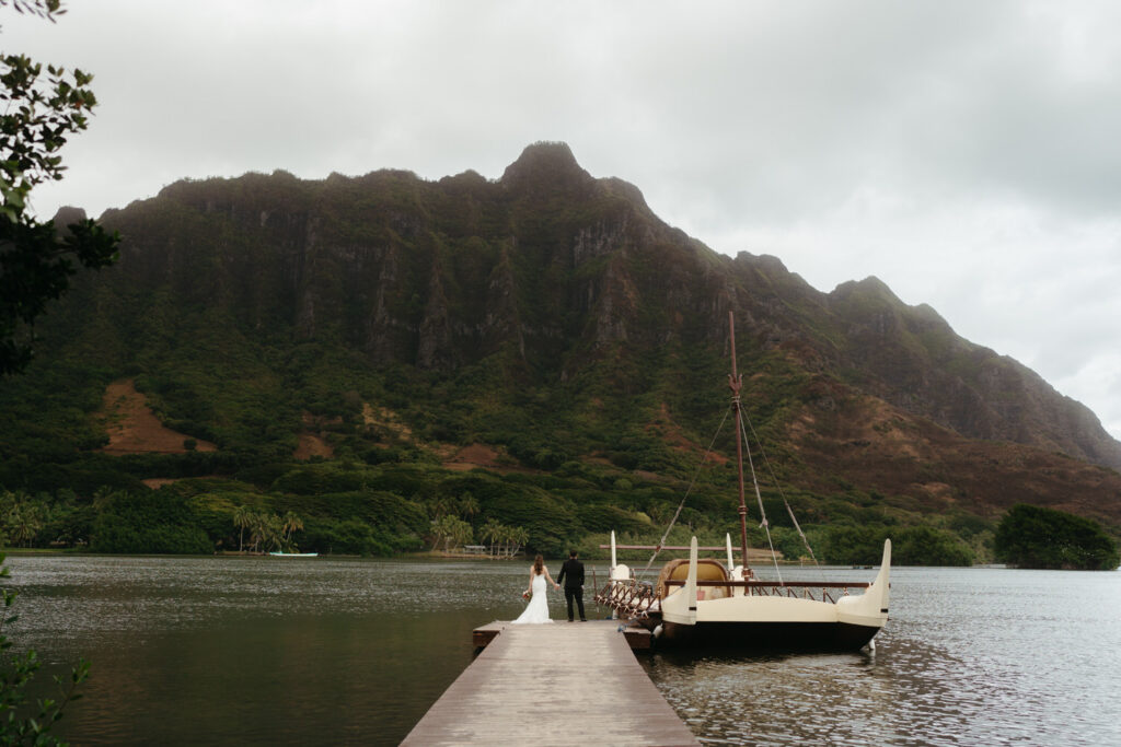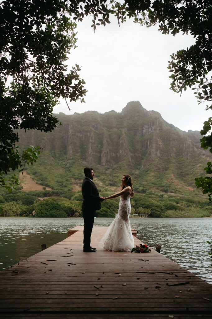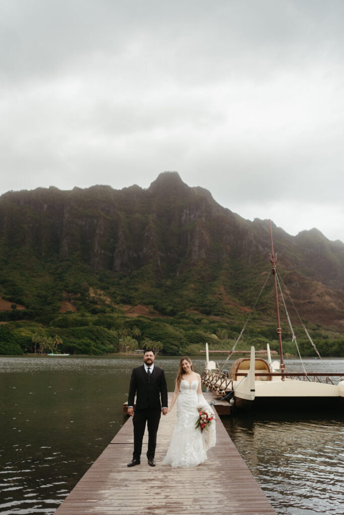 The crown jewel of the day was a private boat ride out to Secret Island, where they stepped out onto a private dock to slow down and enjoy the majesty of the Koʻolau Mountains. We photographed the boat ride by embracing the nautical vibes and capturing them peering out at the island framed by the mast and ropes.