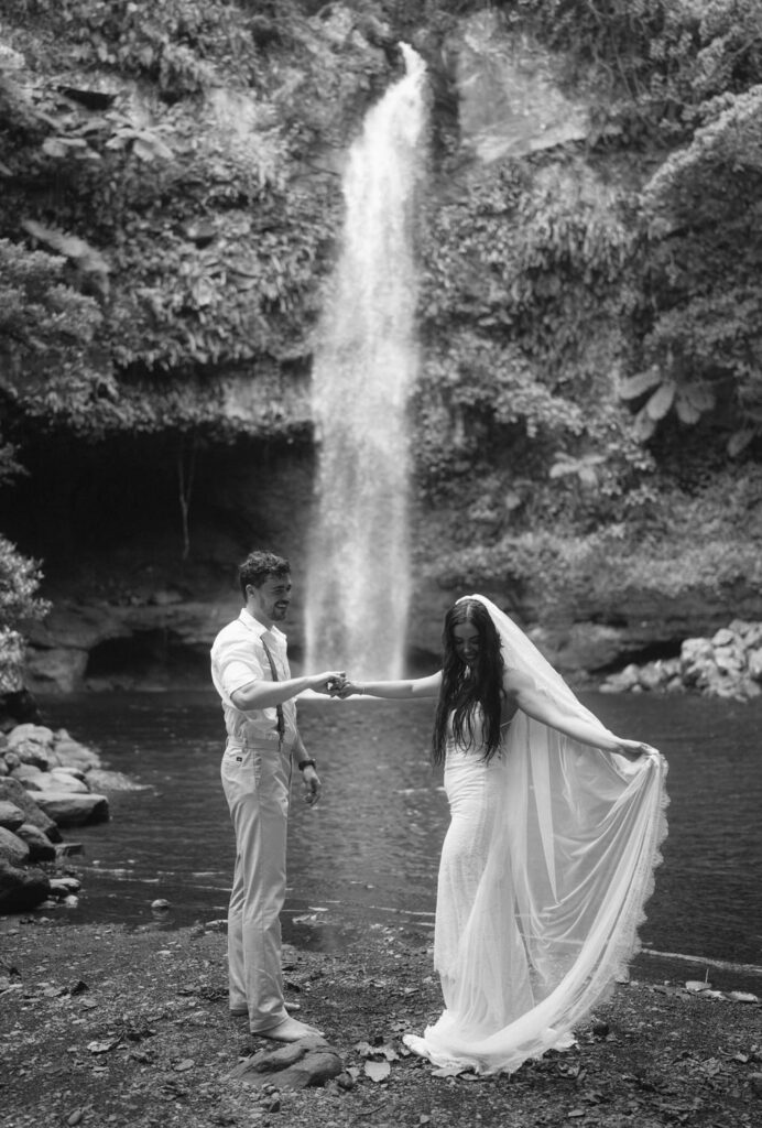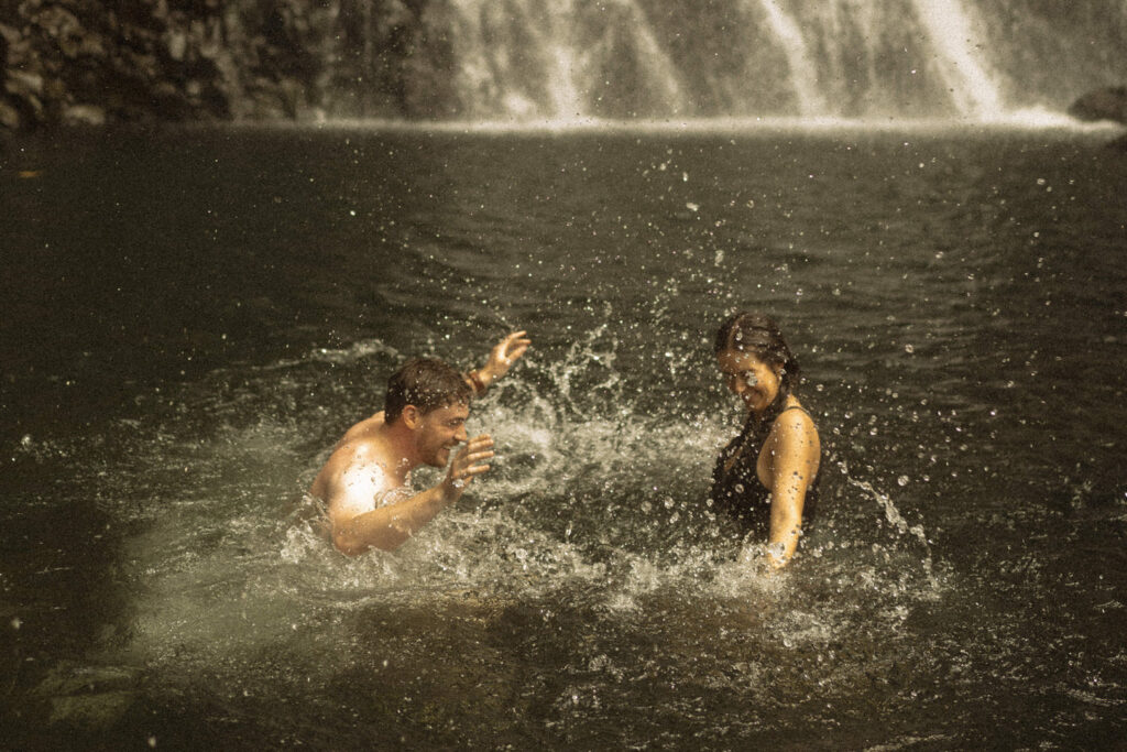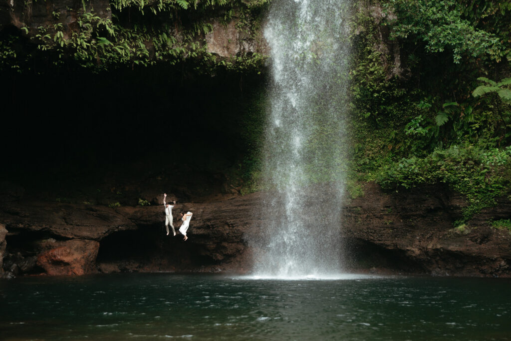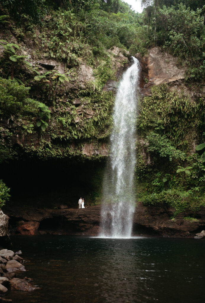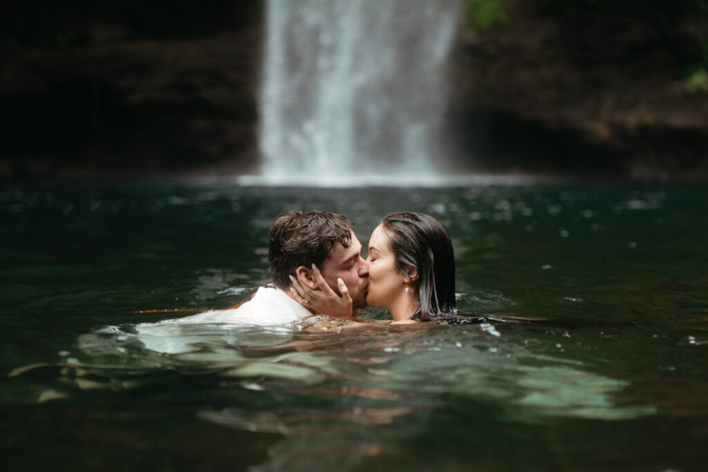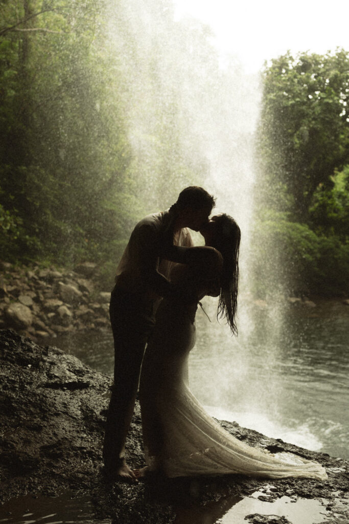 They hiked through the jungle to a secluded waterfall where they swam before putting on their wedding clothes and returning to the main massive waterfall. They jumped right into the water, splashed around, held each other close – imagine swimming in a waterfall on your wedding day!