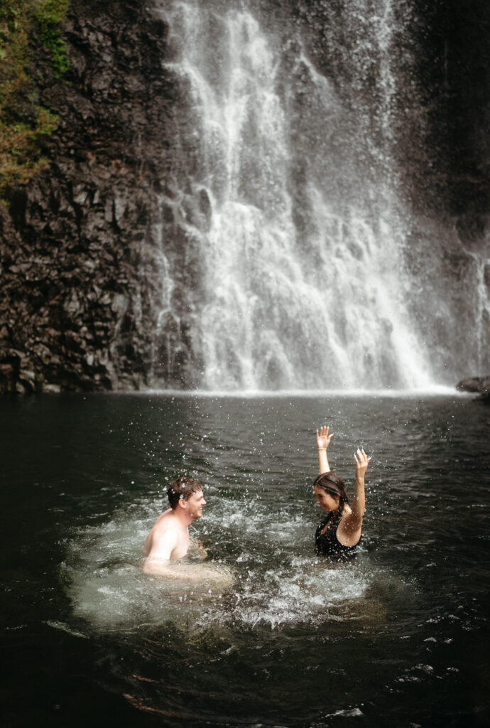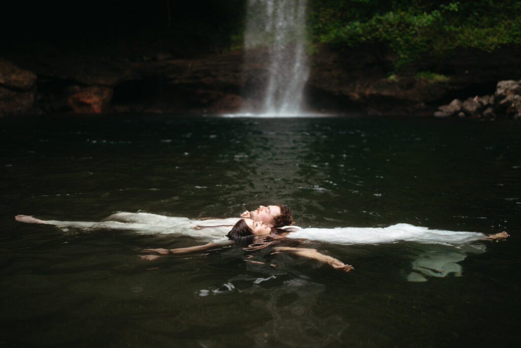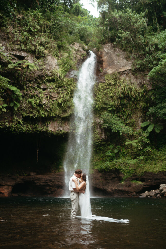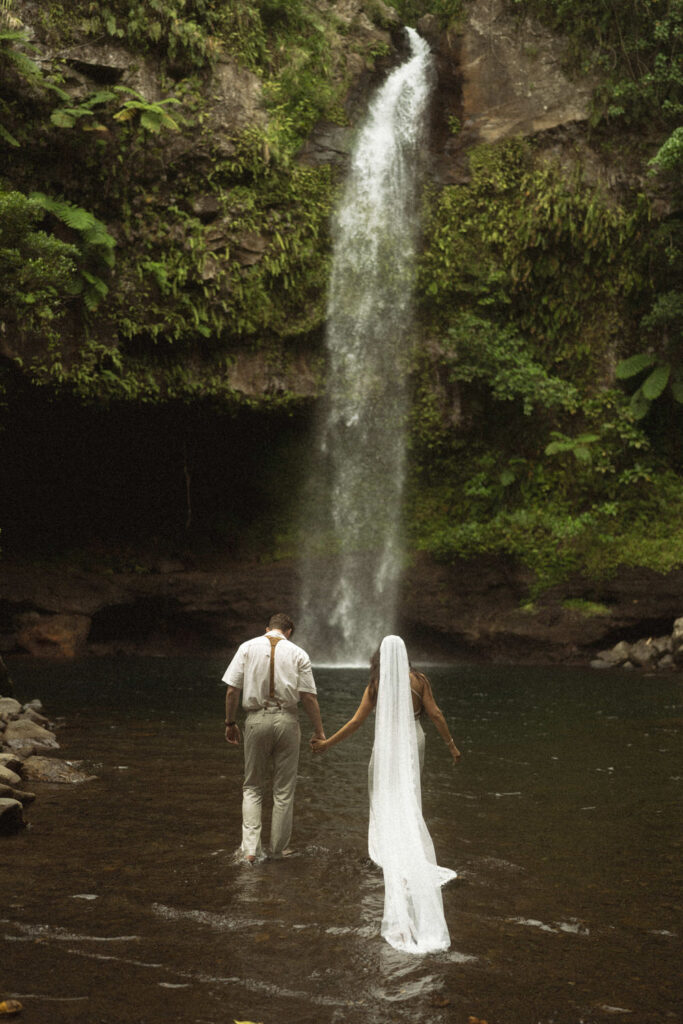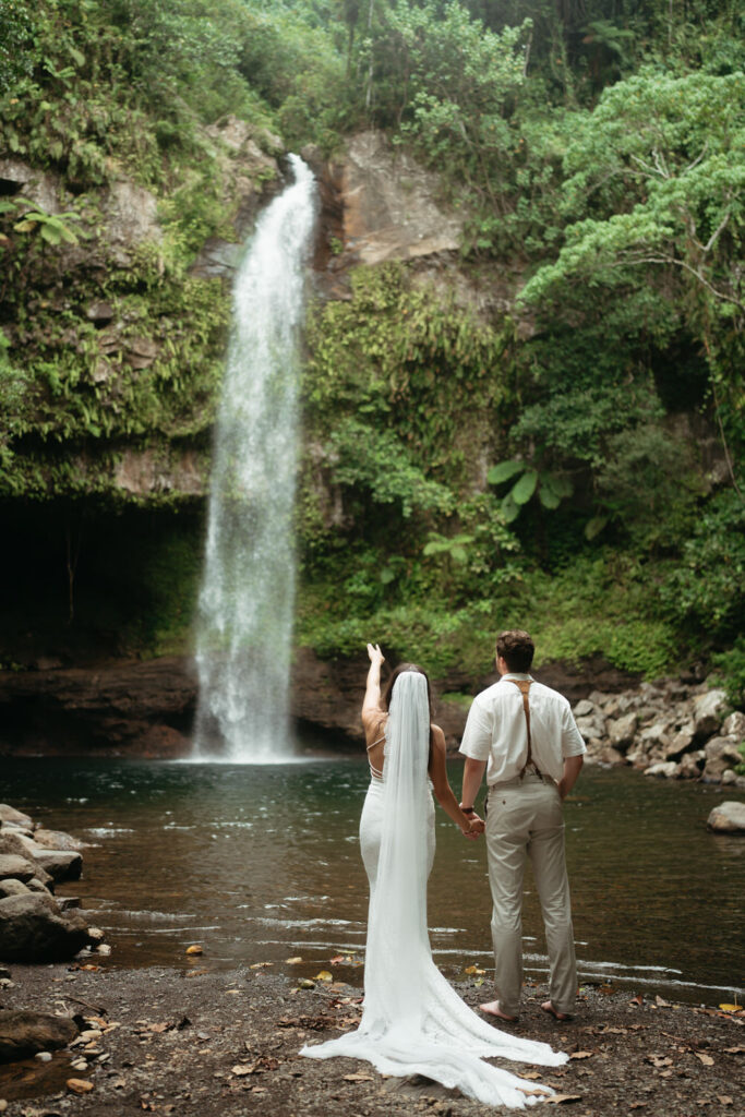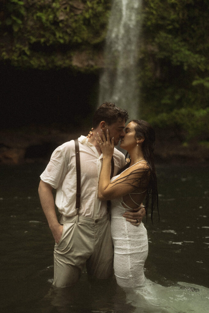 They hiked through the jungle to a secluded waterfall where they swam before putting on their wedding clothes and returning to the main massive waterfall. They jumped right into the water, splashed around, held each other close – imagine swimming in a waterfall on your wedding day!
