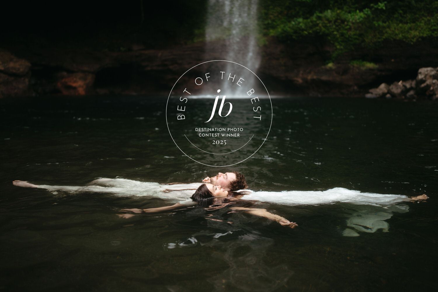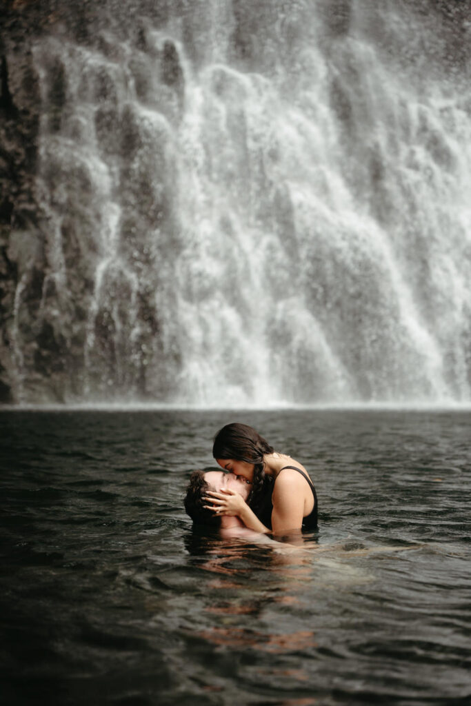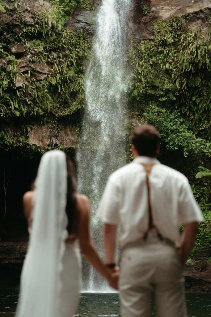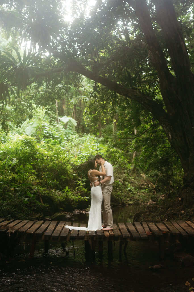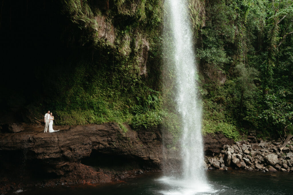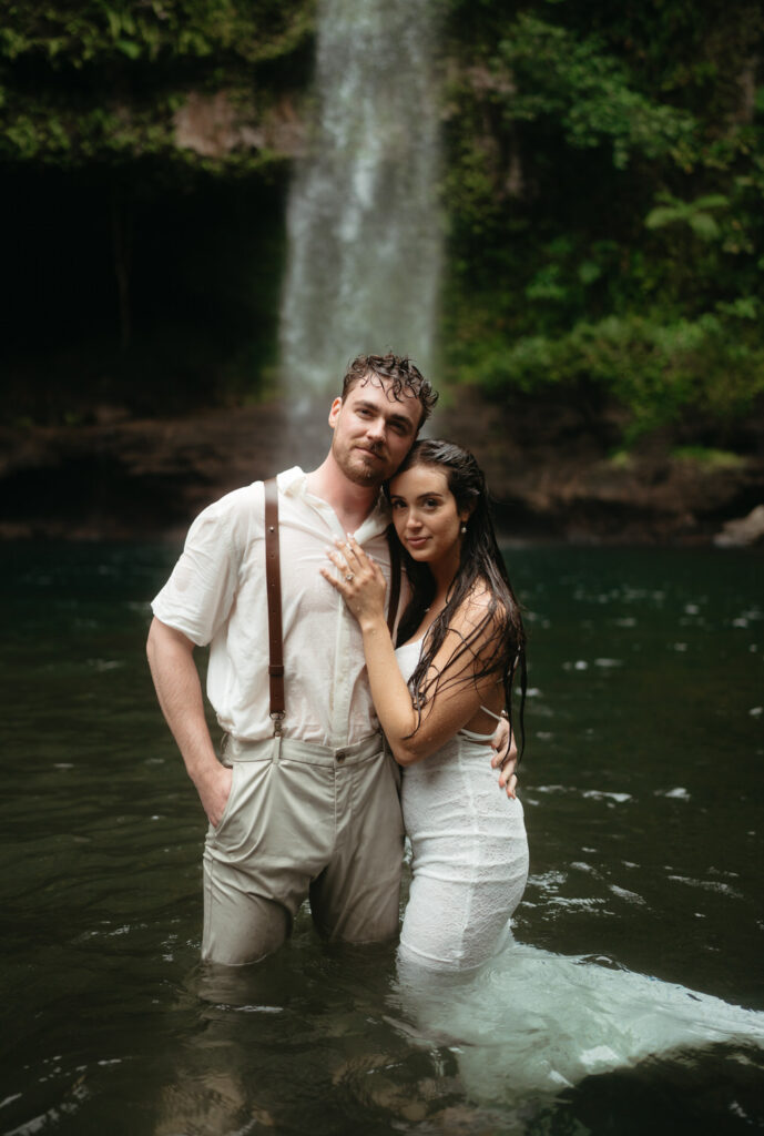 They hiked through the jungle to a secluded waterfall where they swam before putting on their wedding clothes and returning to the main massive waterfall. They jumped right into the water, splashed around, held each other close – imagine swimming in a waterfall on your wedding day!