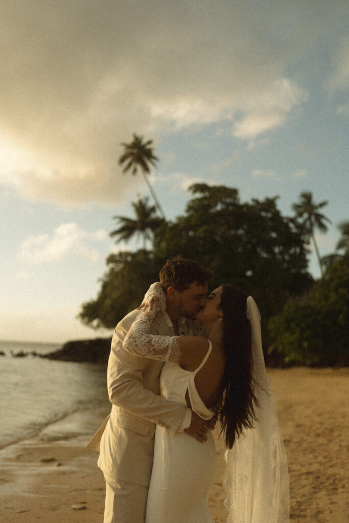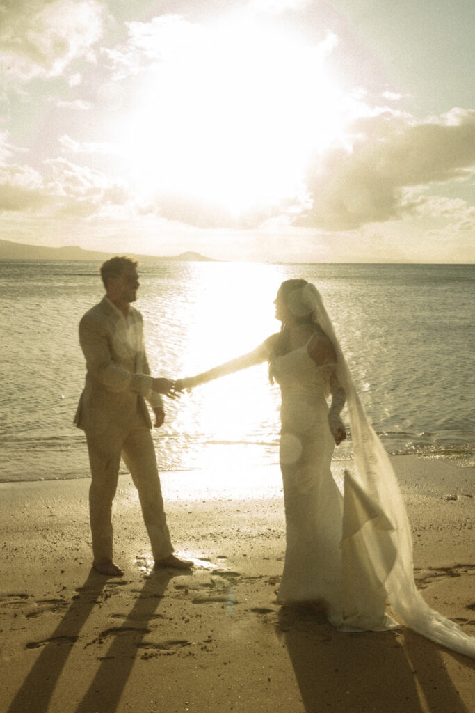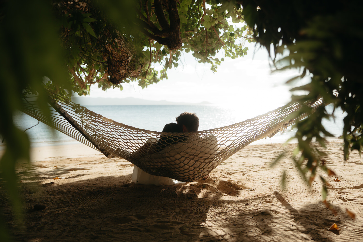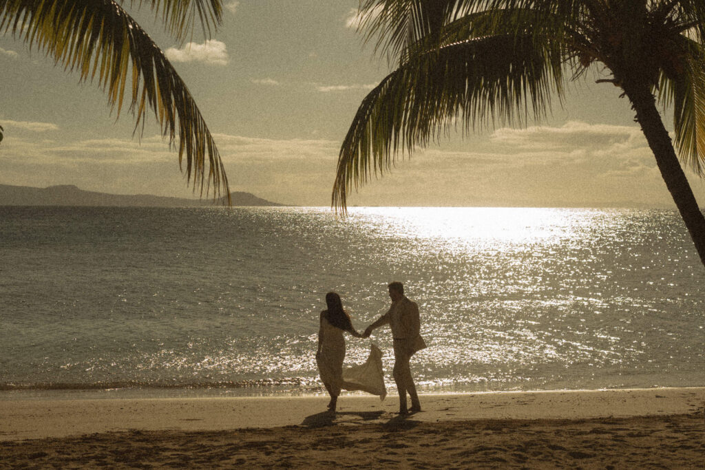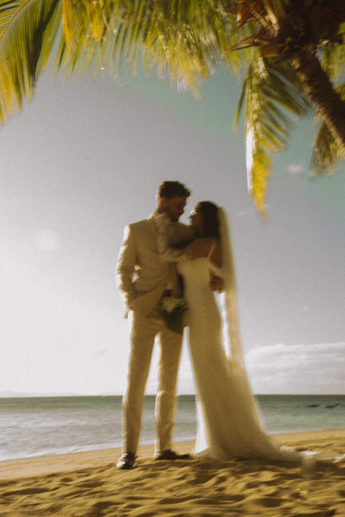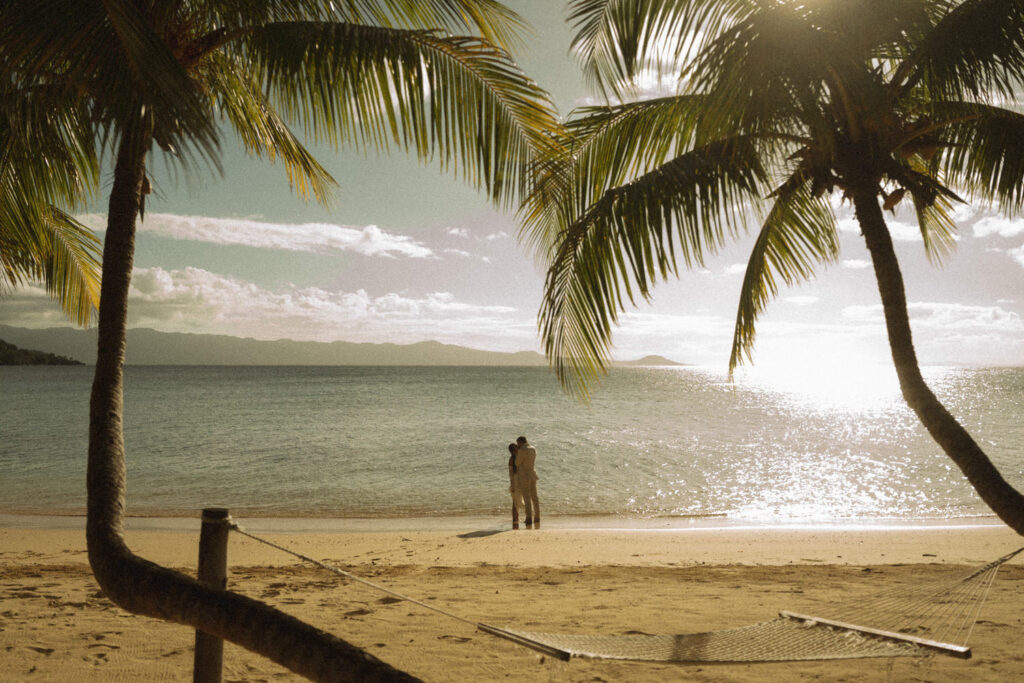 After the ceremony they relaxed together in a hammock, taking the first moments of their marriage to slowly let the reality of the beauty around them sink in. Then they frolicked up and down the beach, dancing and laughing one moment, gazing out at the view the next. Bathed in the sunset with tropical paradise surrounding them – they looked more beautiful and overflowing with magic than ever before.