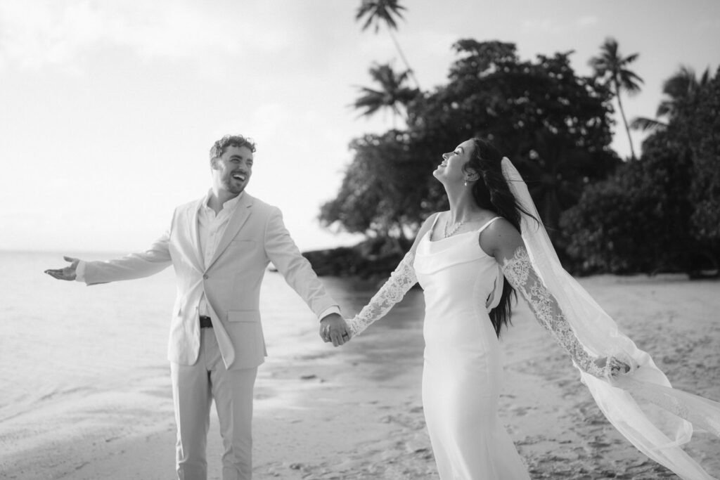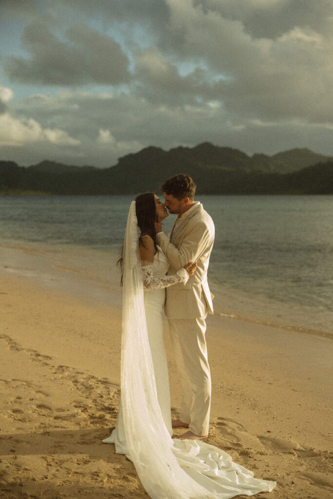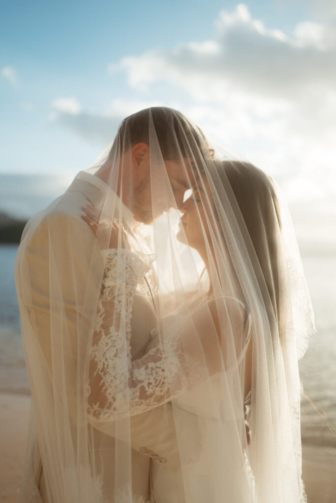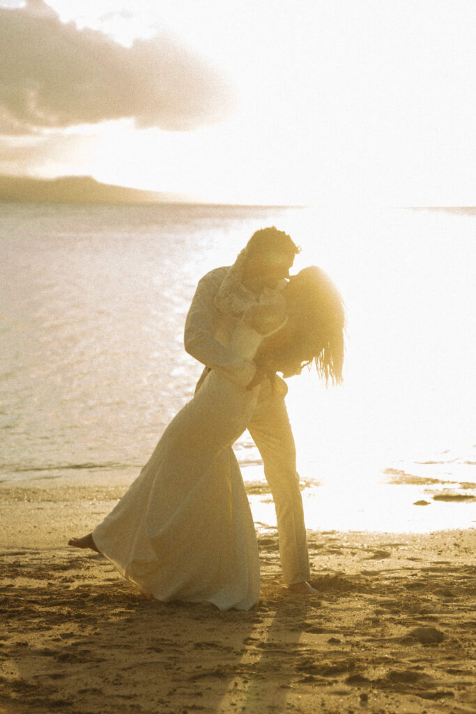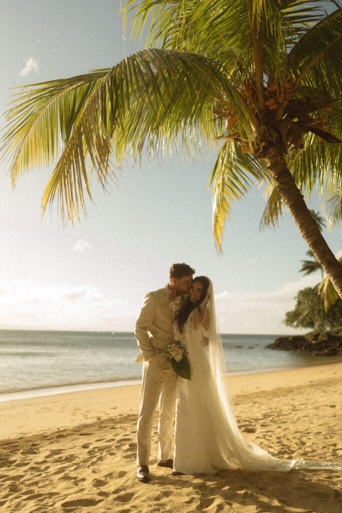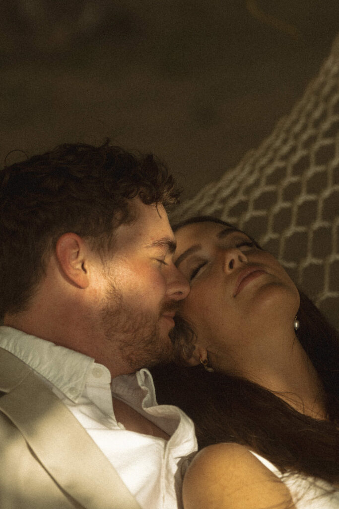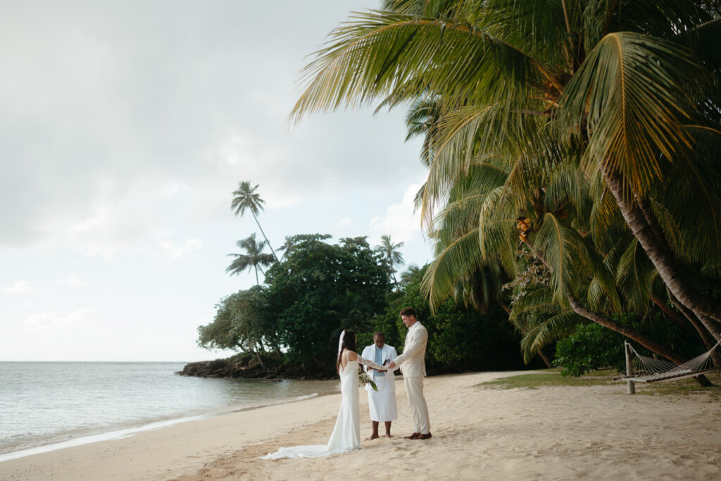 After the ceremony they relaxed together in a hammock, taking the first moments of their marriage to slowly let the reality of the beauty around them sink in. Then they frolicked up and down the beach, dancing and laughing one moment, gazing out at the view the next. Bathed in the sunset with tropical paradise surrounding them – they looked more beautiful and overflowing with magic than ever before.