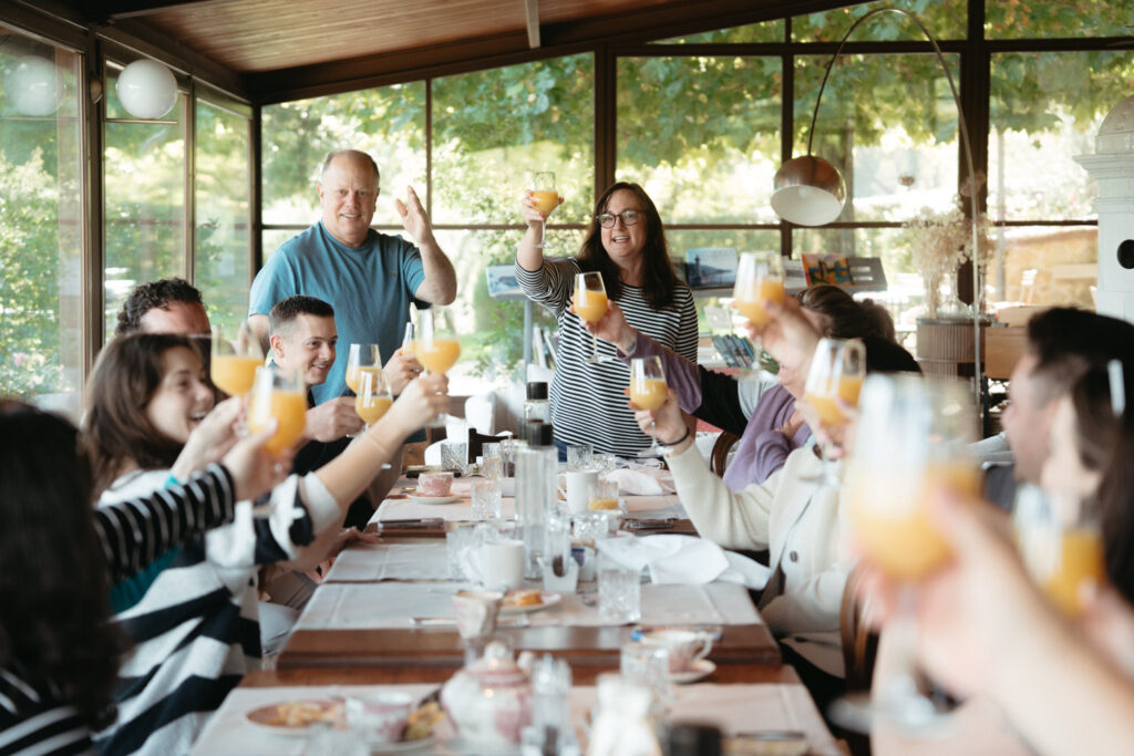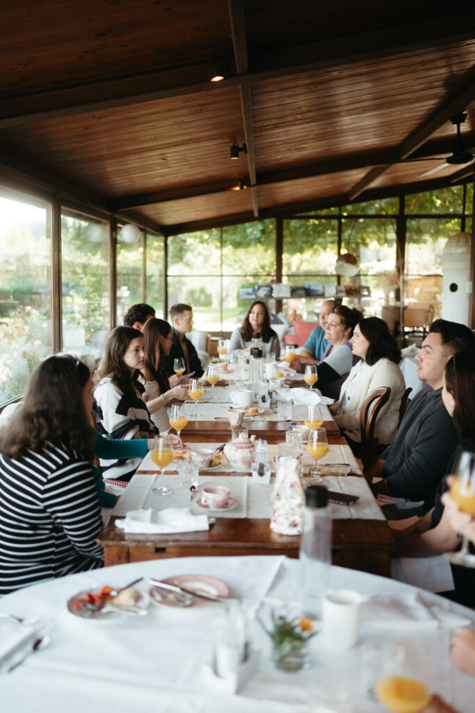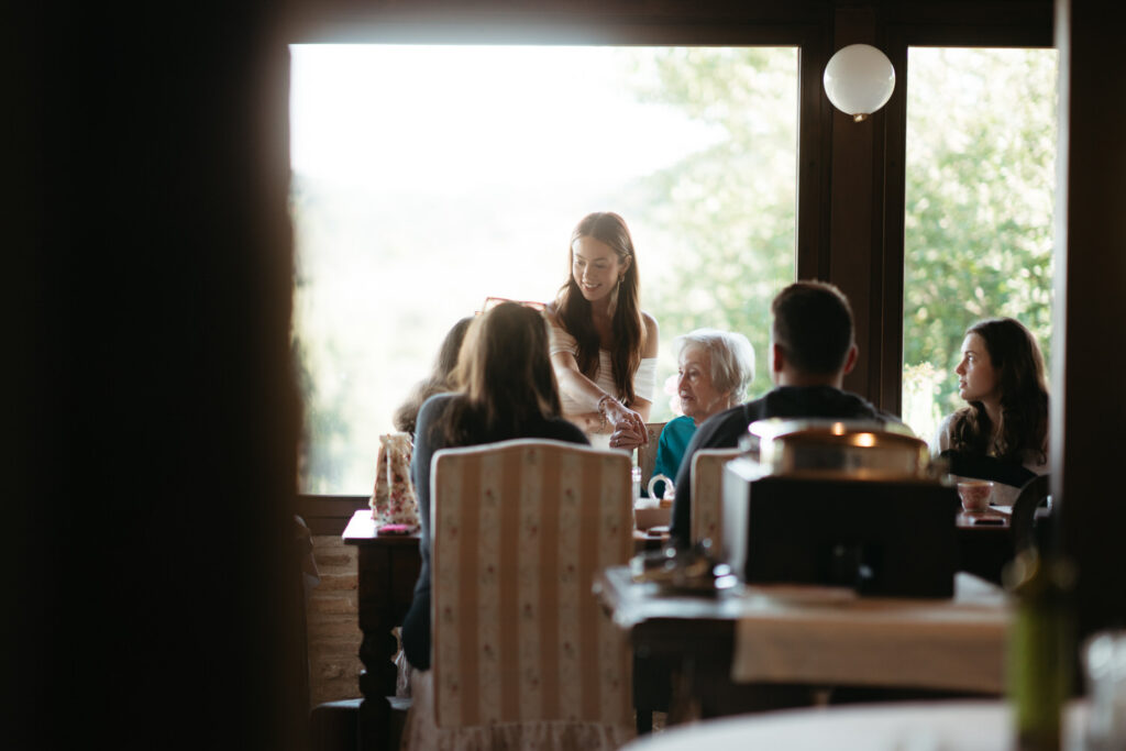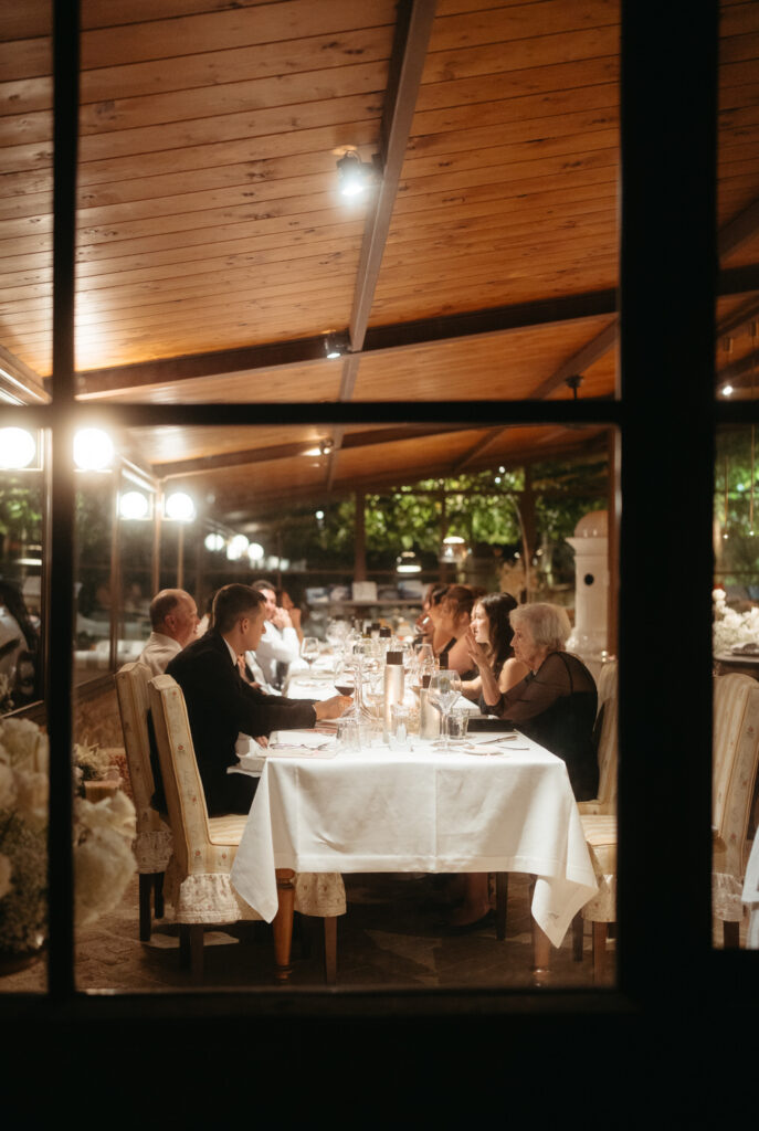 After this time alone they rejoined their family to end the day exactly how it began, at a long table with their loved ones, enjoying good food, good wine, and great company late into the night: “Fare serata“