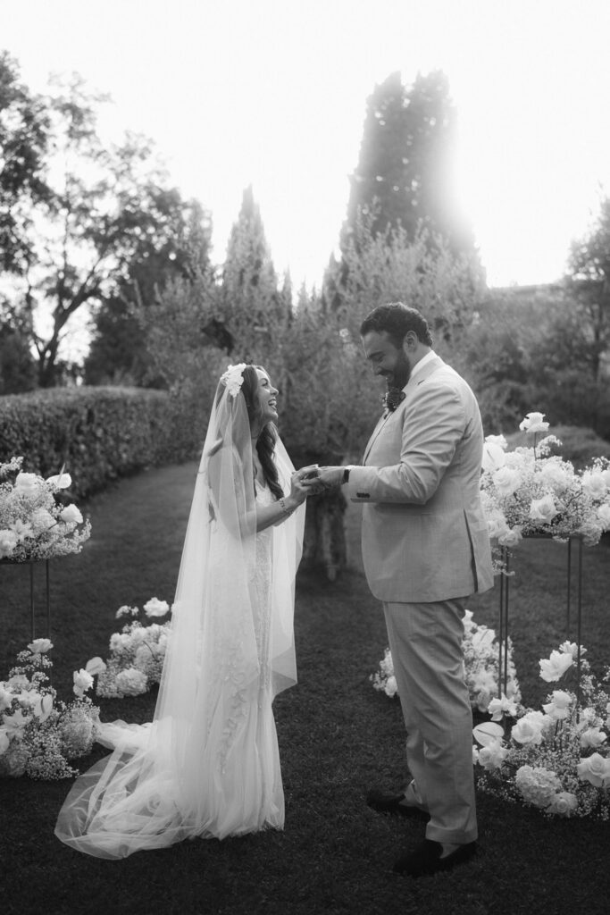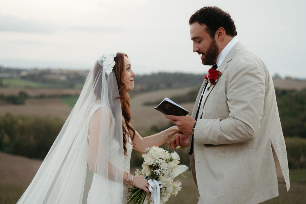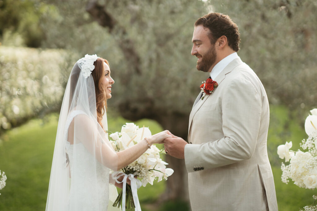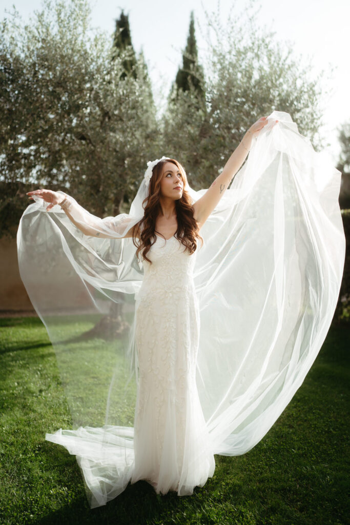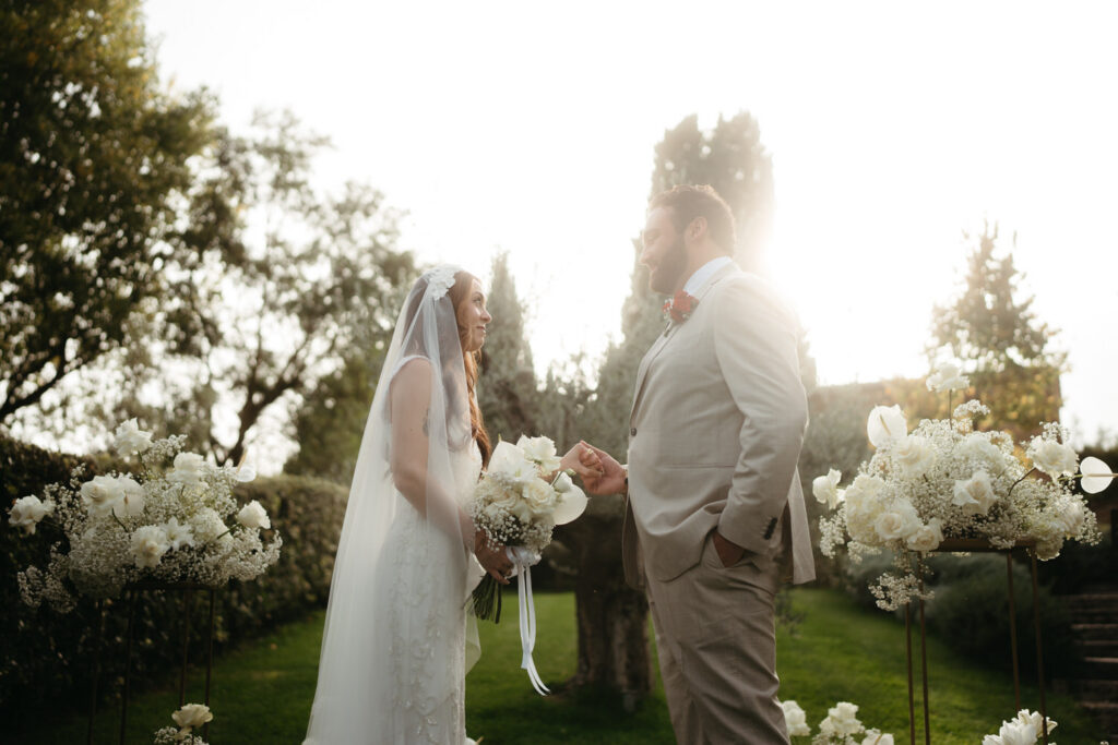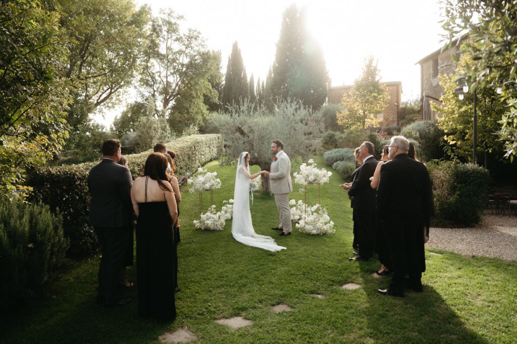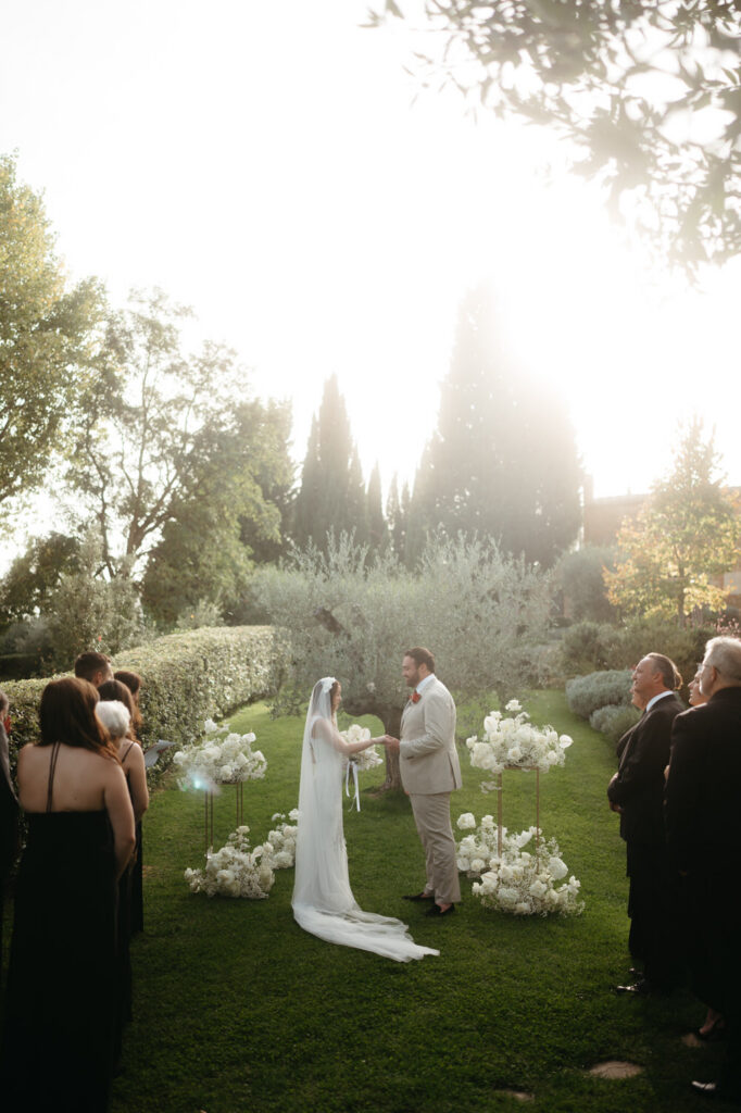 Then came the gorgeous ceremony with the soft Tuscan sunshine shining down on them, they joined hands in front of an old olive tree – we chose this ceremony location after assessing where the sun would be, and we felt an ancient olive tree was the perfect encapsulation of their Tuscany elopement and the decades of growth their marriage would enjoy.