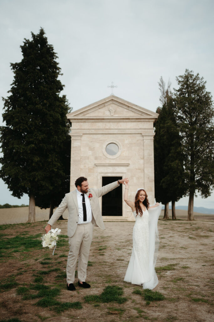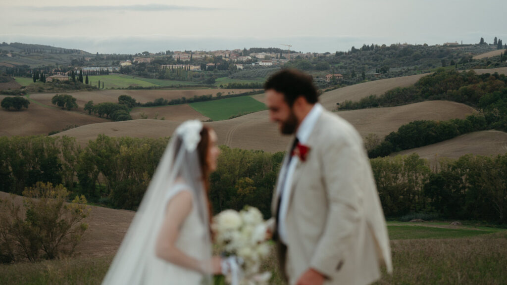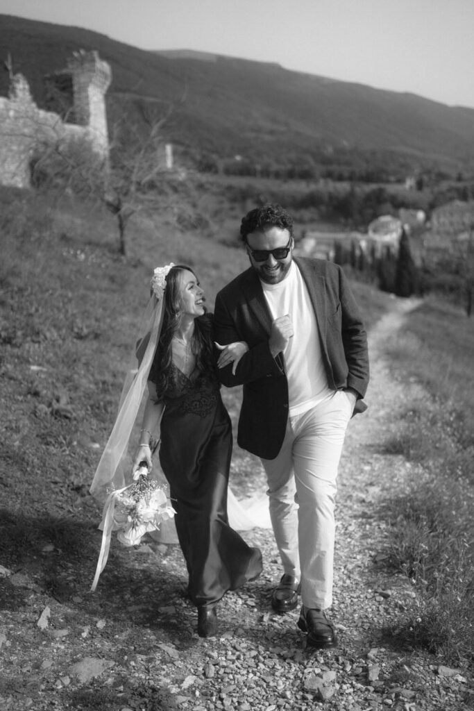 We leaned into the surroundings and captured cinematic photos that drew out the natural beauty of Tuscany and the emotions of Leah and Rob. We focused on prompts that drew out their natural joy and emotions for each other, and poses that drew on the editorial vibe of Tuscany. October was an amazing time for their elopement with ideal weather, harvest season beauty, and that golden Tuscan light.