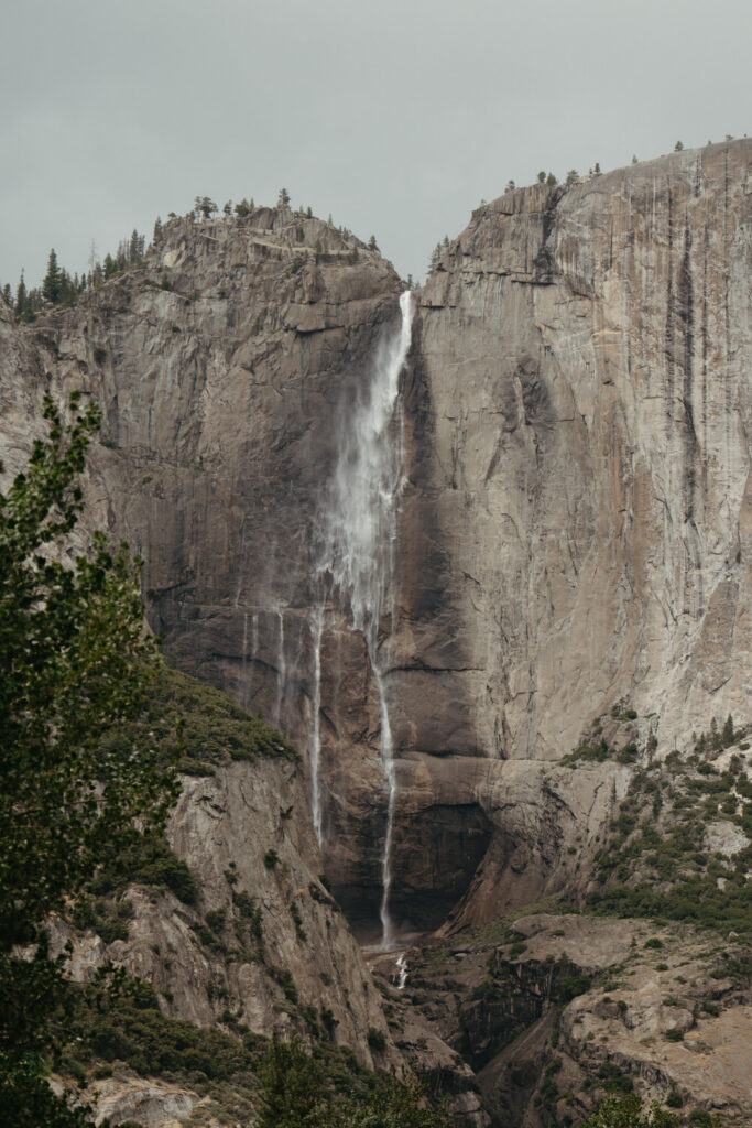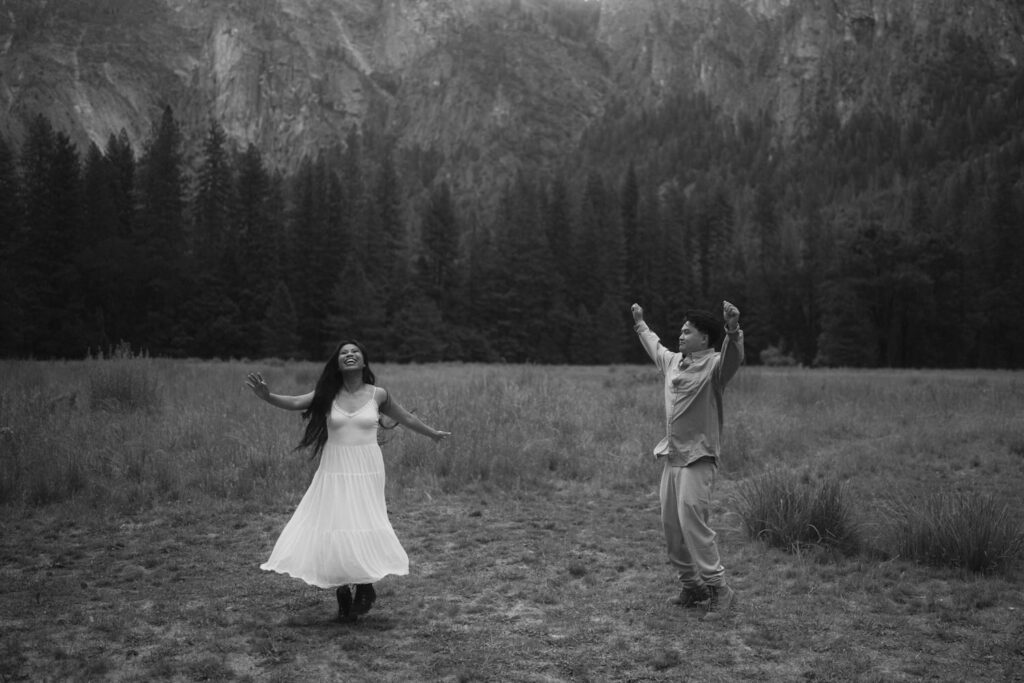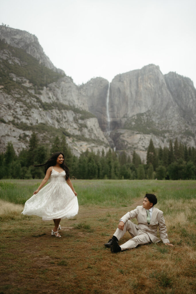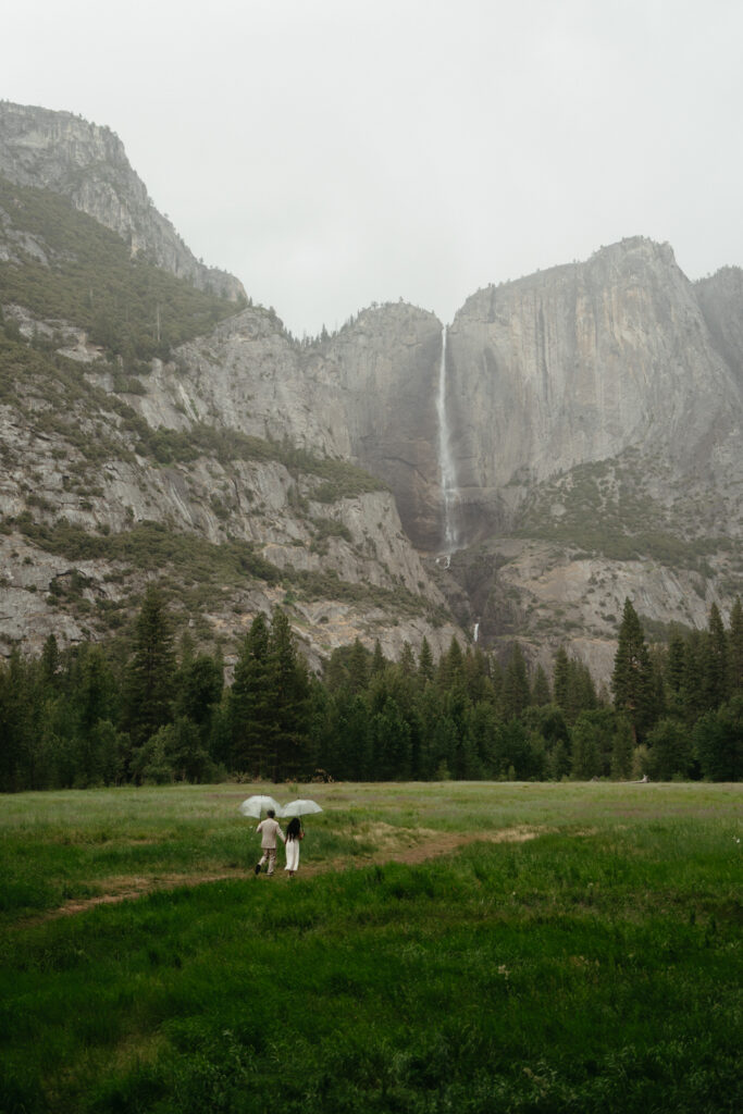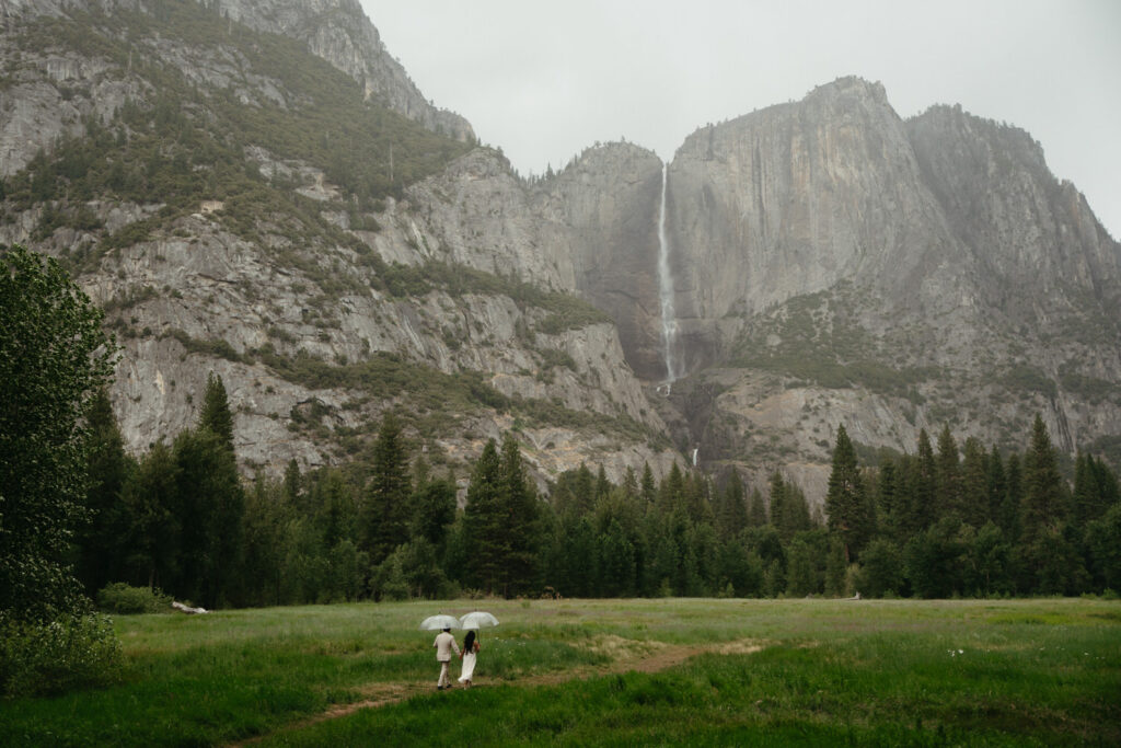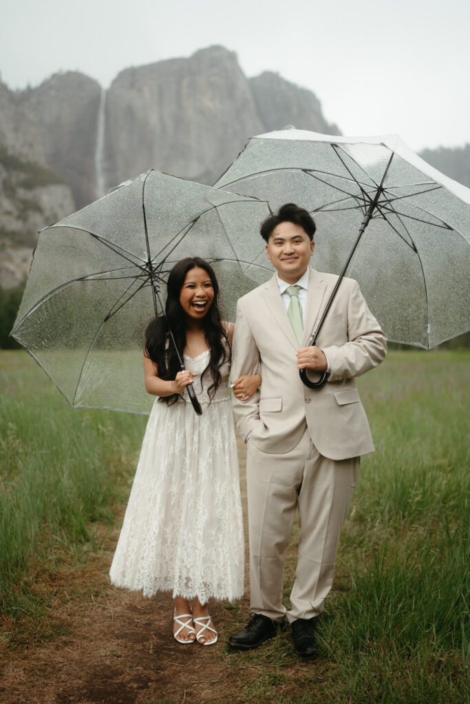 We met up with them at Swinging Bridge with an amazing view of Yosemite Falls. Since it was raining, there was barely anyone else around, which was perfect for them to have the place to themselves! They danced around and frolicked, first using the big clear umbrellas we brought for them, then embracing the rain and letting it pour on them. We got some incredible photos here, especially wides including the waterfall in the background.