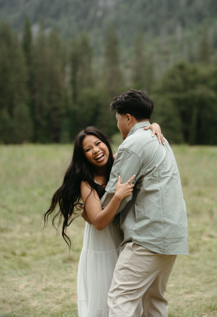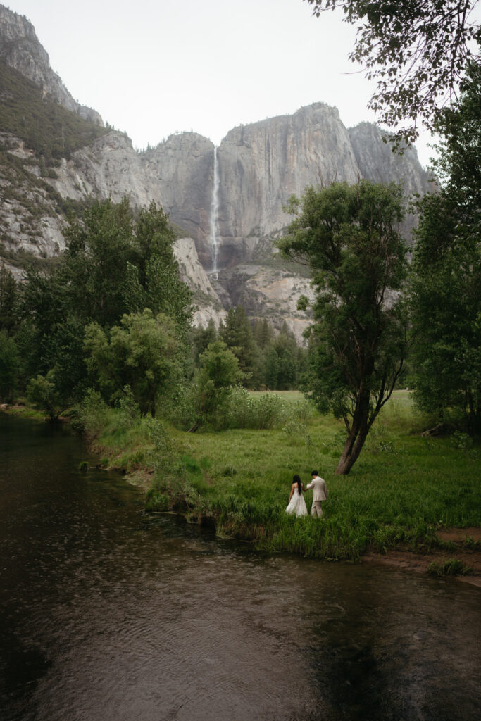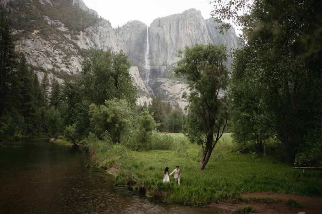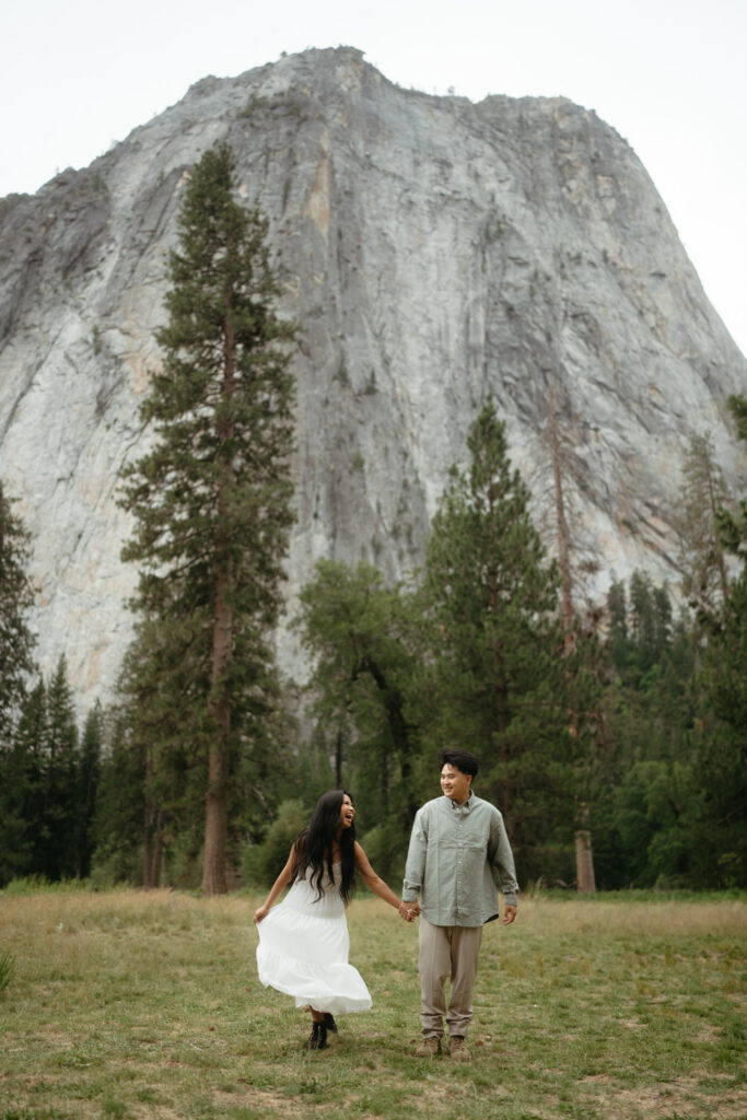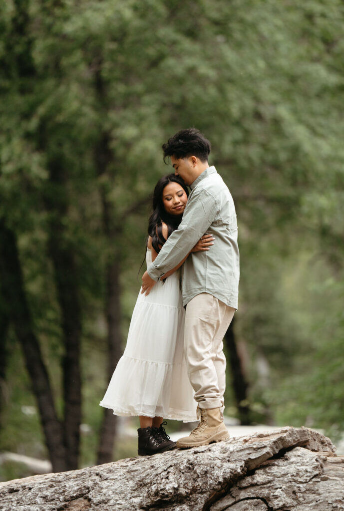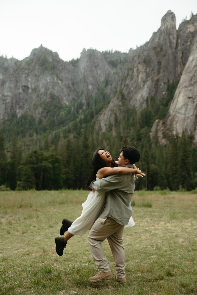 We met up with them at Swinging Bridge with an amazing view of Yosemite Falls. Since it was raining, there was barely anyone else around, which was perfect for them to have the place to themselves! They danced around and frolicked, first using the big clear umbrellas we brought for them, then embracing the rain and letting it pour on them. We got some incredible photos here, especially wides including the waterfall in the background.