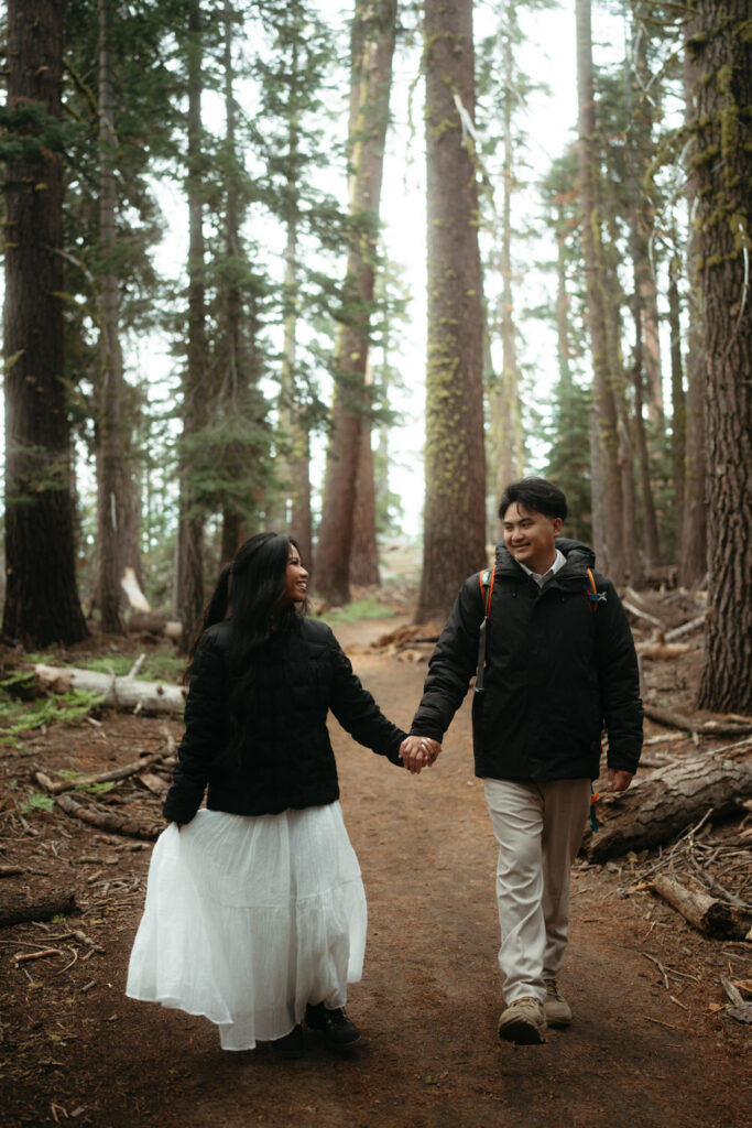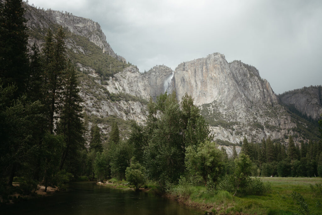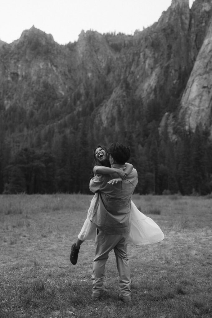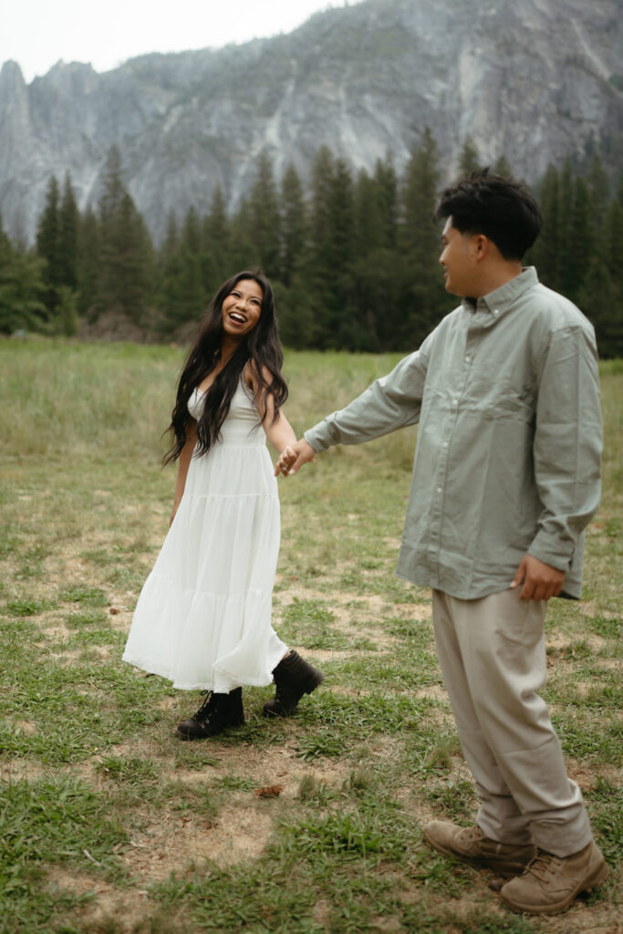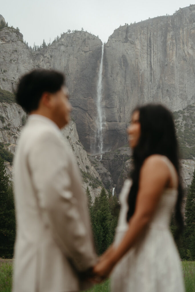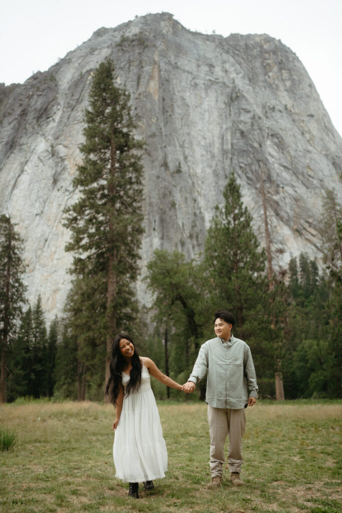 We met up with them at Swinging Bridge with an amazing view of Yosemite Falls. Since it was raining, there was barely anyone else around, which was perfect for them to have the place to themselves! They danced around and frolicked, first using the big clear umbrellas we brought for them, then embracing the rain and letting it pour on them. We got some incredible photos here, especially wides including the waterfall in the background.