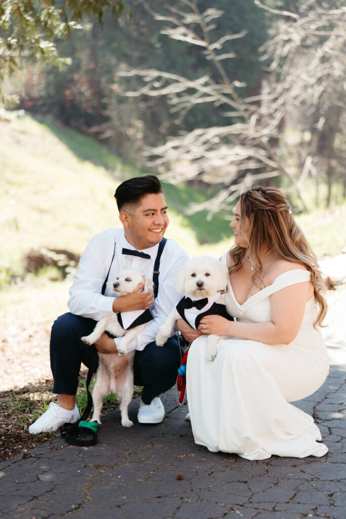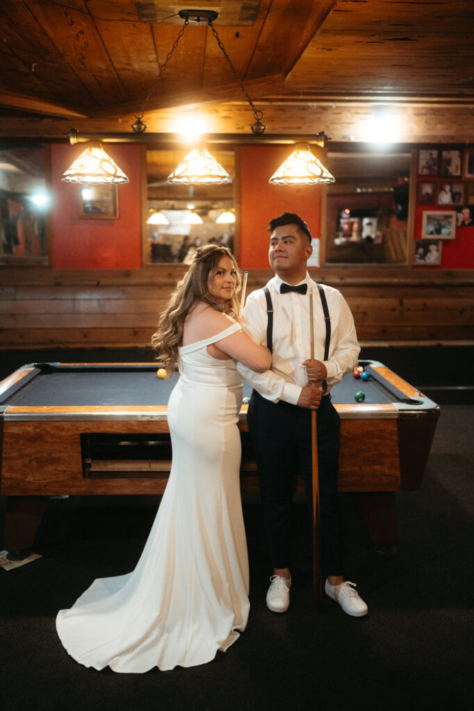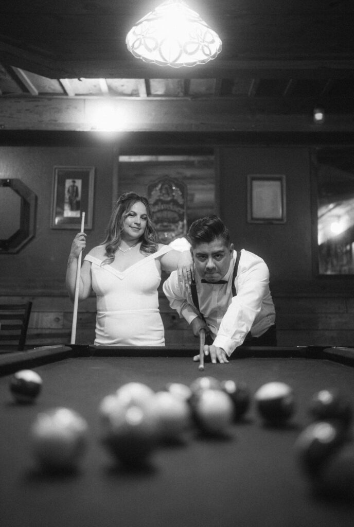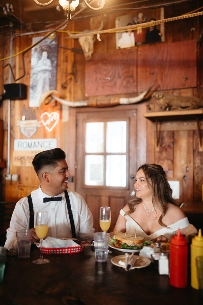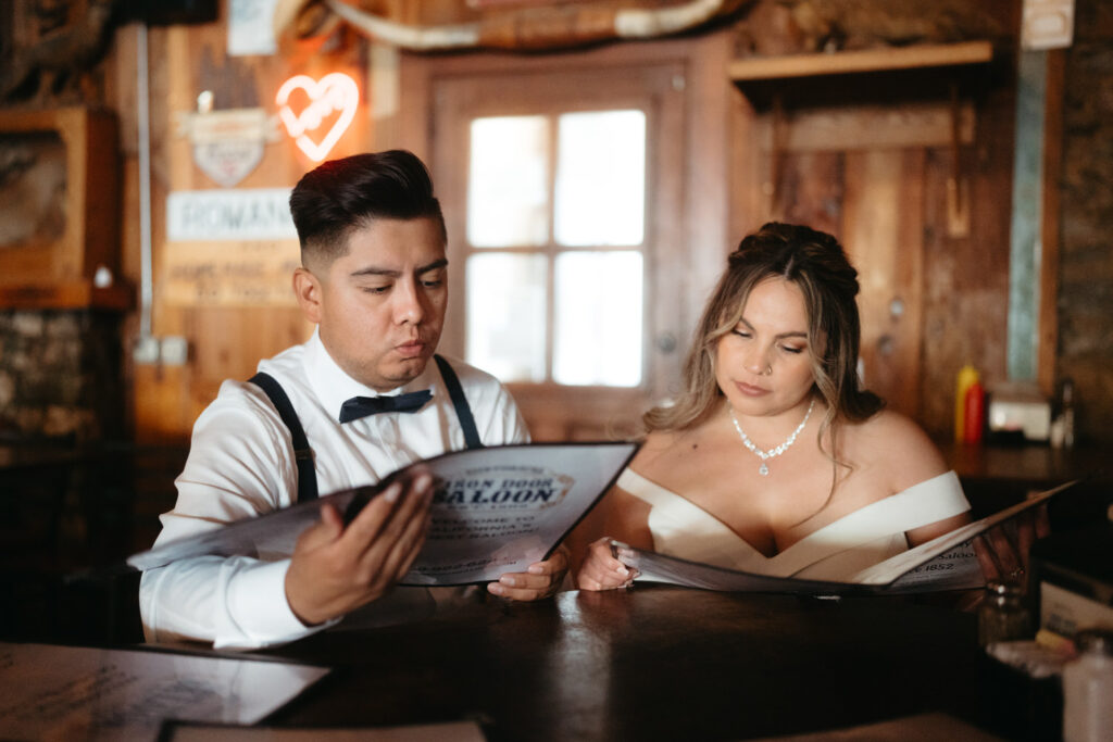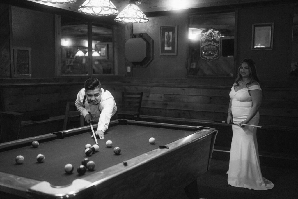 Their elopement day unfolded beautifully thanks to all the planning. They started with a first look outside their hotel, one of us photographing a close-up of Victor’s reaction, the other capturing a full-body shot of the moment. Then of course some pictures with their beloved dogs. While stopping in town for a quick lunch they played some spontaneous pool at California’s oldest operating saloon, totally unplanned and so awesome! One of those go-with-the-flow moments that can only happen when you’re eloping.