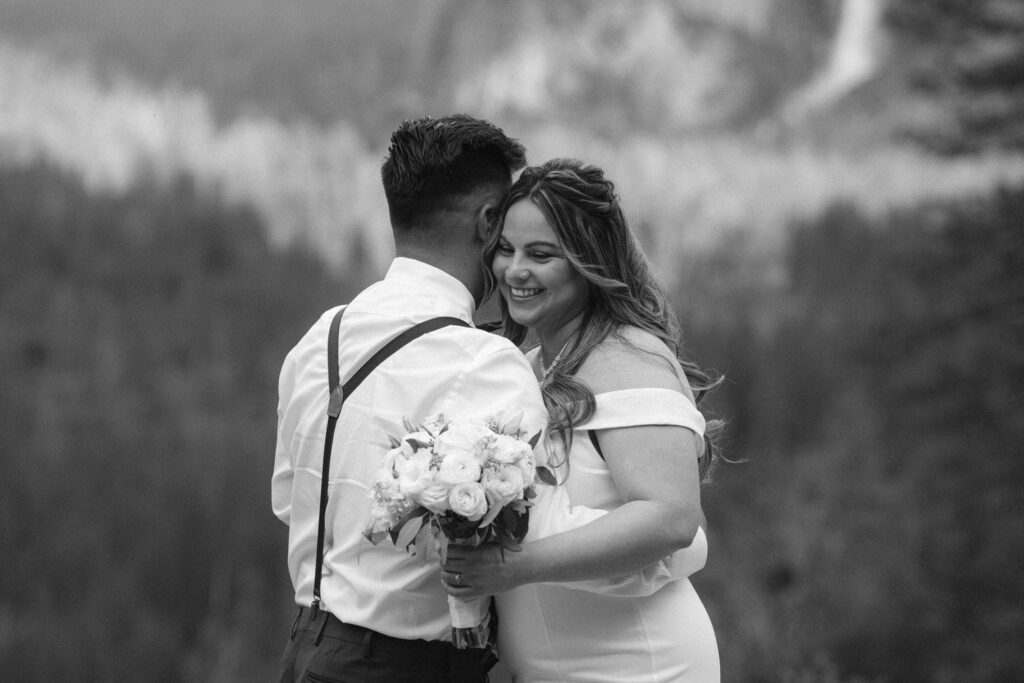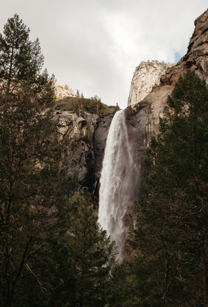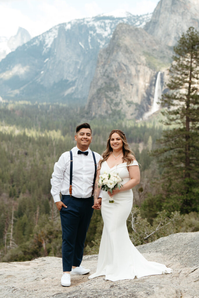 They drove to the quiet spot we chose for them near Tunnel View to exchange emotional private vows. With nothing written down, they just poured out their hearts on the spot. Getting to witness their heartfelt vows with Tunnel View laid out behind them was truly beautiful. We gave them privacy while using our longer lenses to capture their emotion, and our wide angle lenses to frame them within the gorgeous landscape. Then they stopped by Bridalveil Fall to get some of those iconic waterfall views. The waterfall is so tall we have to shoot mostly vertical photos just to fit it in the shot!